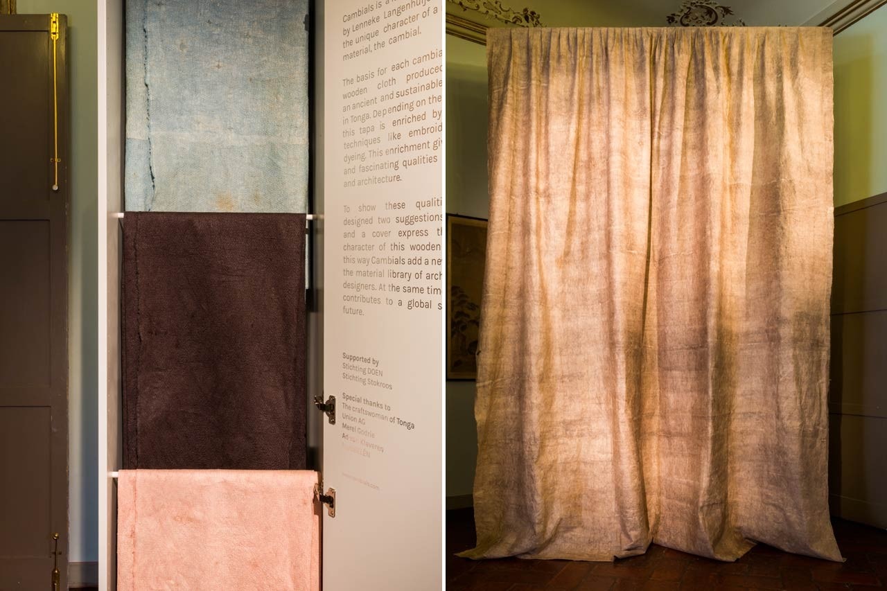 The basis for each “cambial” is tapa, a wood cloth produced using ancient and sustainable artisan methods in Tonga that is “embellished” with embroidery and dyes to different extents depending on the use that the fabric is for.