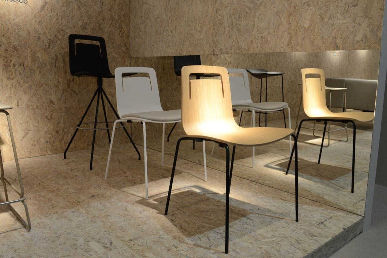 Designed by Victor Carrasco to meet an an order for 10,000 chairs from Tokyo Polytechnic university, Klip is a stackable chair in oak plywood whose name makes reference to the slot in the back that serves both as a handle to make it easy to move and a support for hanging bags.