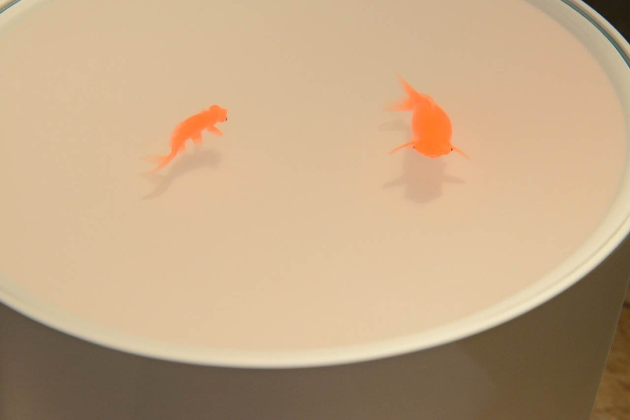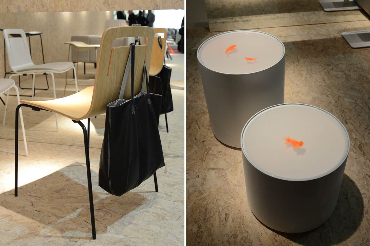 Up in the air meanwhile is a series of two low tables for waiting areas. "I wanted something that was fun" recounts Ramón Úbeda who as well as being designer is art director for BD, Camper and Metalarte – "because I don't like waiting but while I'm waiting I'd like something to contemplate, like goldfish". This gave Úbeda the starting point for a design that was translated into a cylinder with a lacquered surface with handmade resin fish floating in it. The material that fills the concave surface of the table top is a patented ecological resin, an invisible, stable material with advanced technical characteristics, the outcome of industrial research that cannot be disclosed.