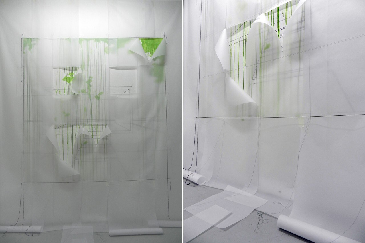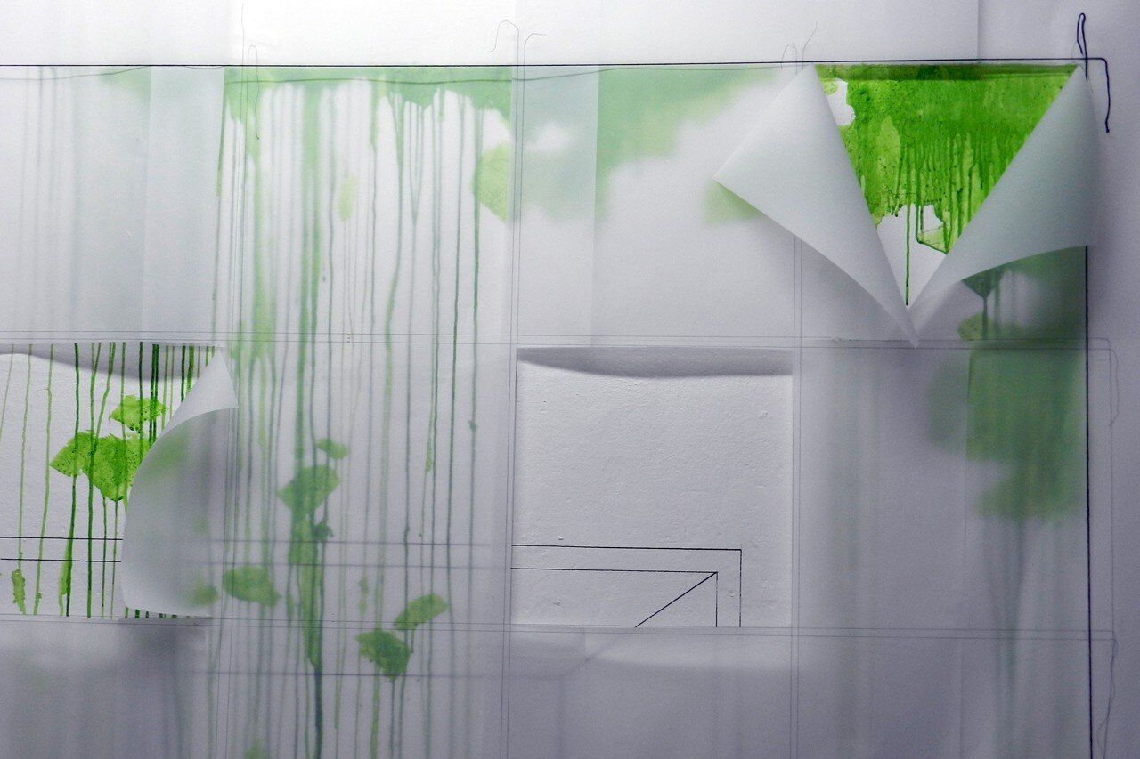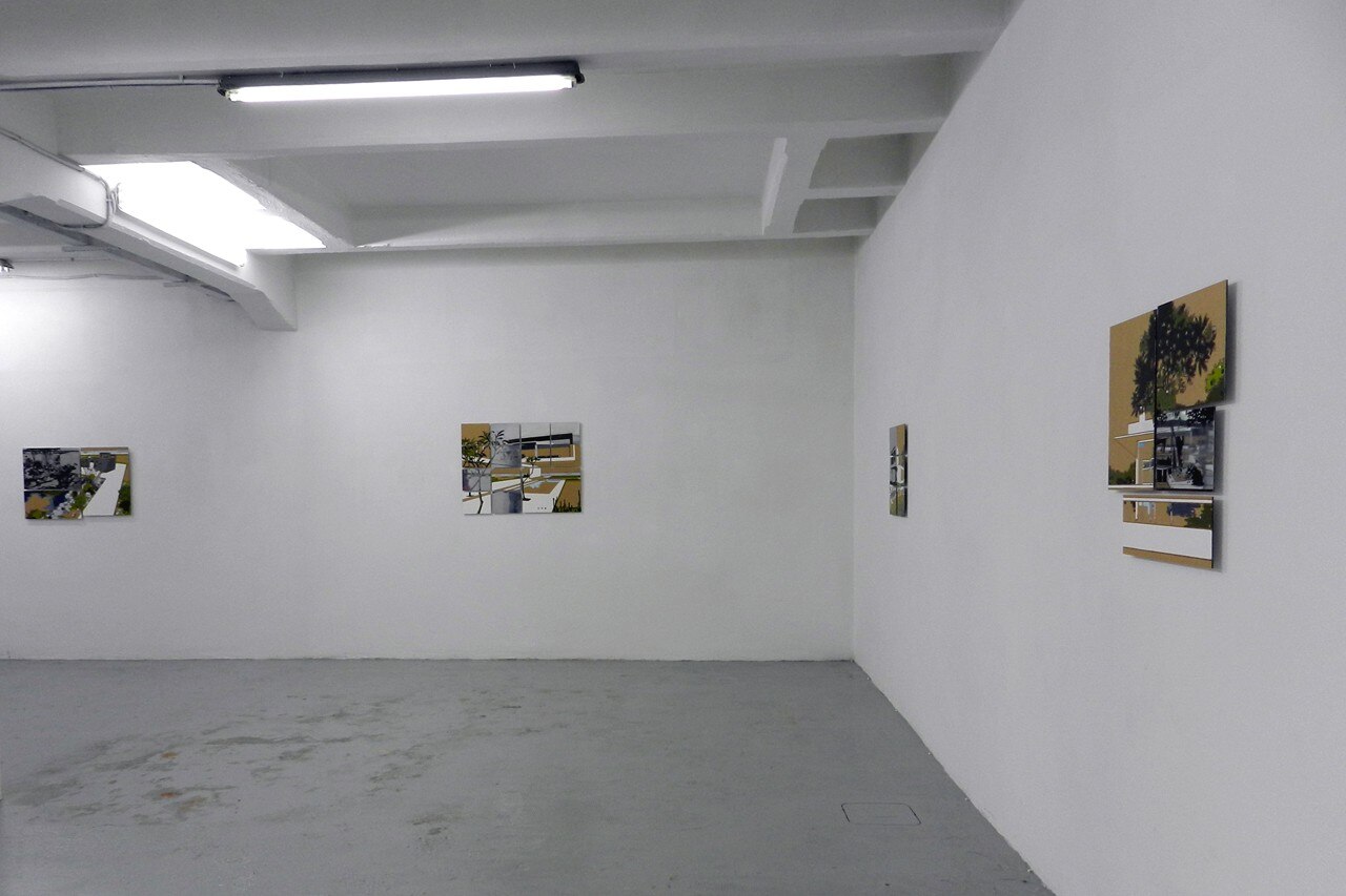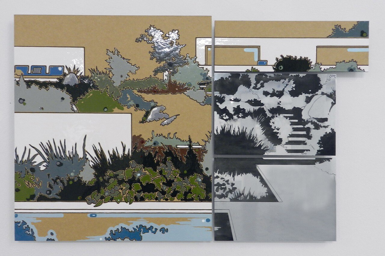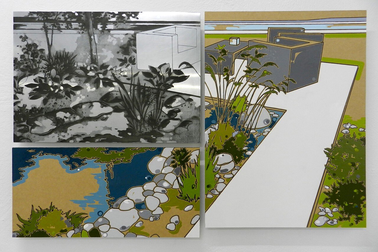 Top: Guido Bagini, Technogreen #002, 2014, enamel on cardboard and zinc polished on dibond, 56x112 cm (detail). Above: Guido Bagini, “The secret life of plants”, exhibition view