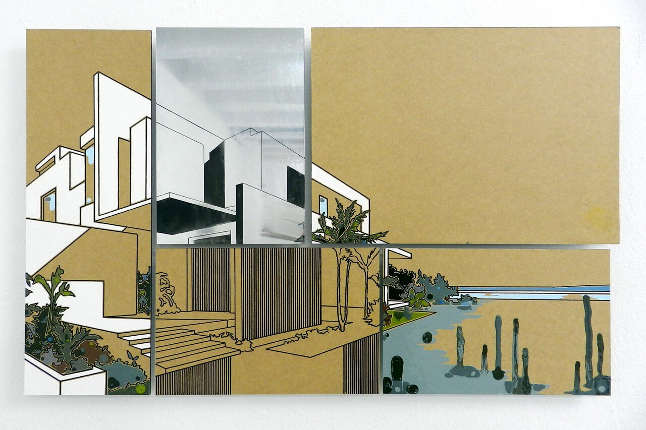 To further emphasize the feeling of suspension in time and fogging of overlapping realities, Guido Bagini uses besides the usual materials (cardboard glued on Dibond) tablets of reflective zinc etched with acid.