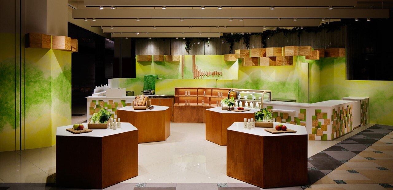 The design of the Yume Marche Store (“dream market”) features the golden sun and green forest associated with the farmland. The combination of these two elements lend the store its characteristic palette and create an imagery brimming with the vitality of yellow and green tones, which come together in a signature gradation that spreads throughout the whole space.