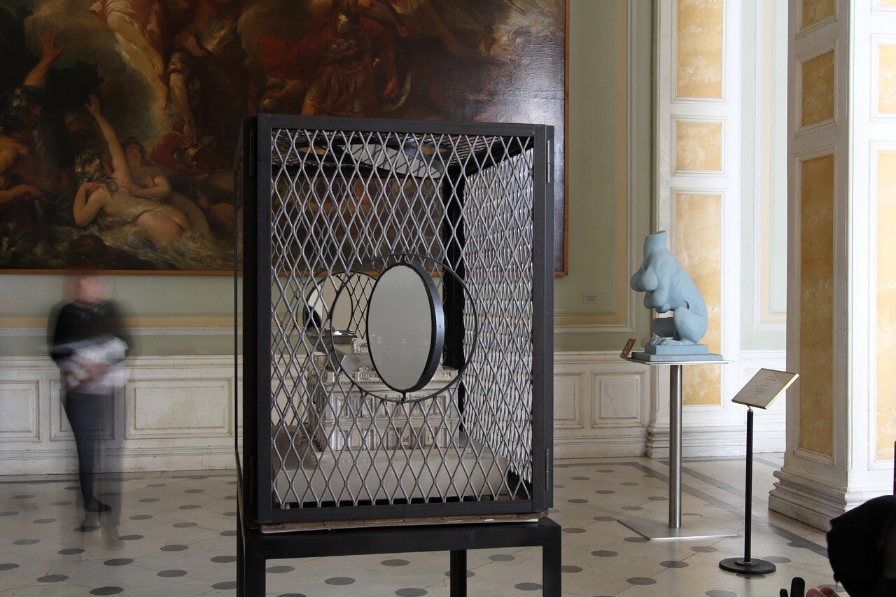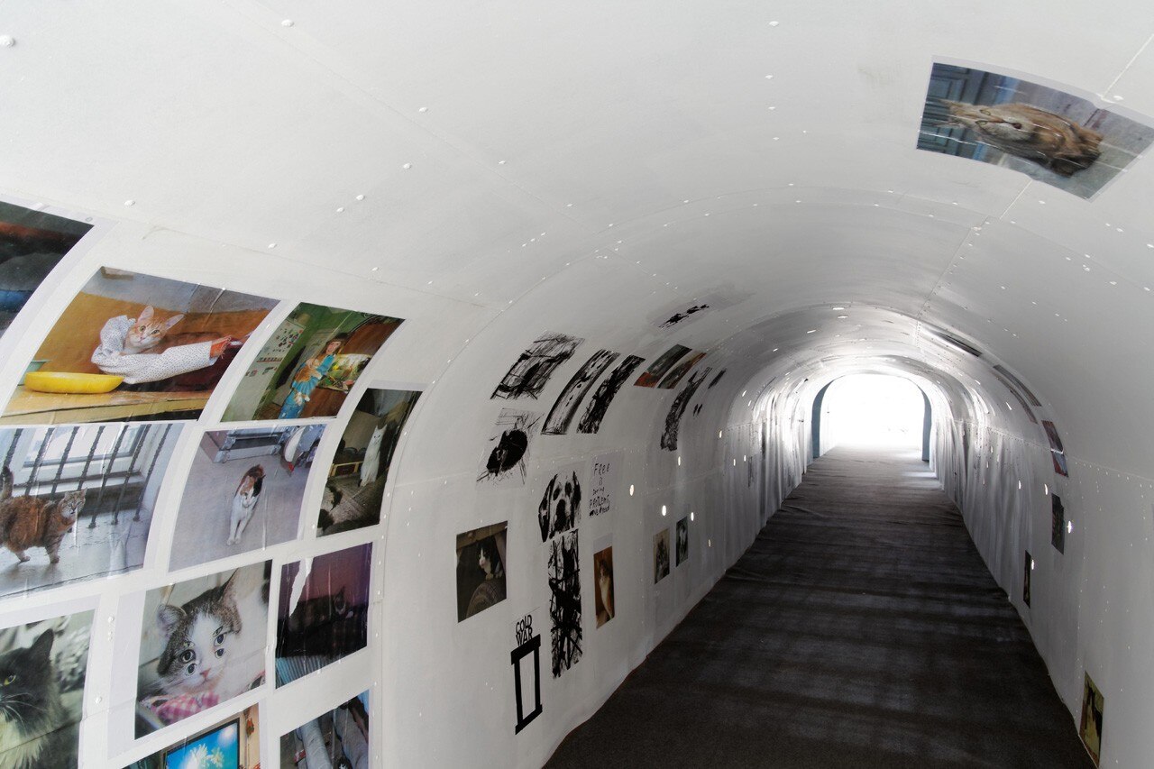 Erik van Lieshout, The Basement, 2014, Mixed media installation: HD, color, sound, 17:19 min, Wood, color copies. Courtesy Annet Gelink Gallery, Amsterdam, Netherlands. Commissioned by MANIFESTA 10 St. Petersburg. With the financial support from the Mondriaan Fund, The Netherlands Film Fund, Outset Netherlands, and Wilhelmina E. Jansen Fund. Installation view, MANIFESTA 10, General Staff Building, State Hermitage Museum