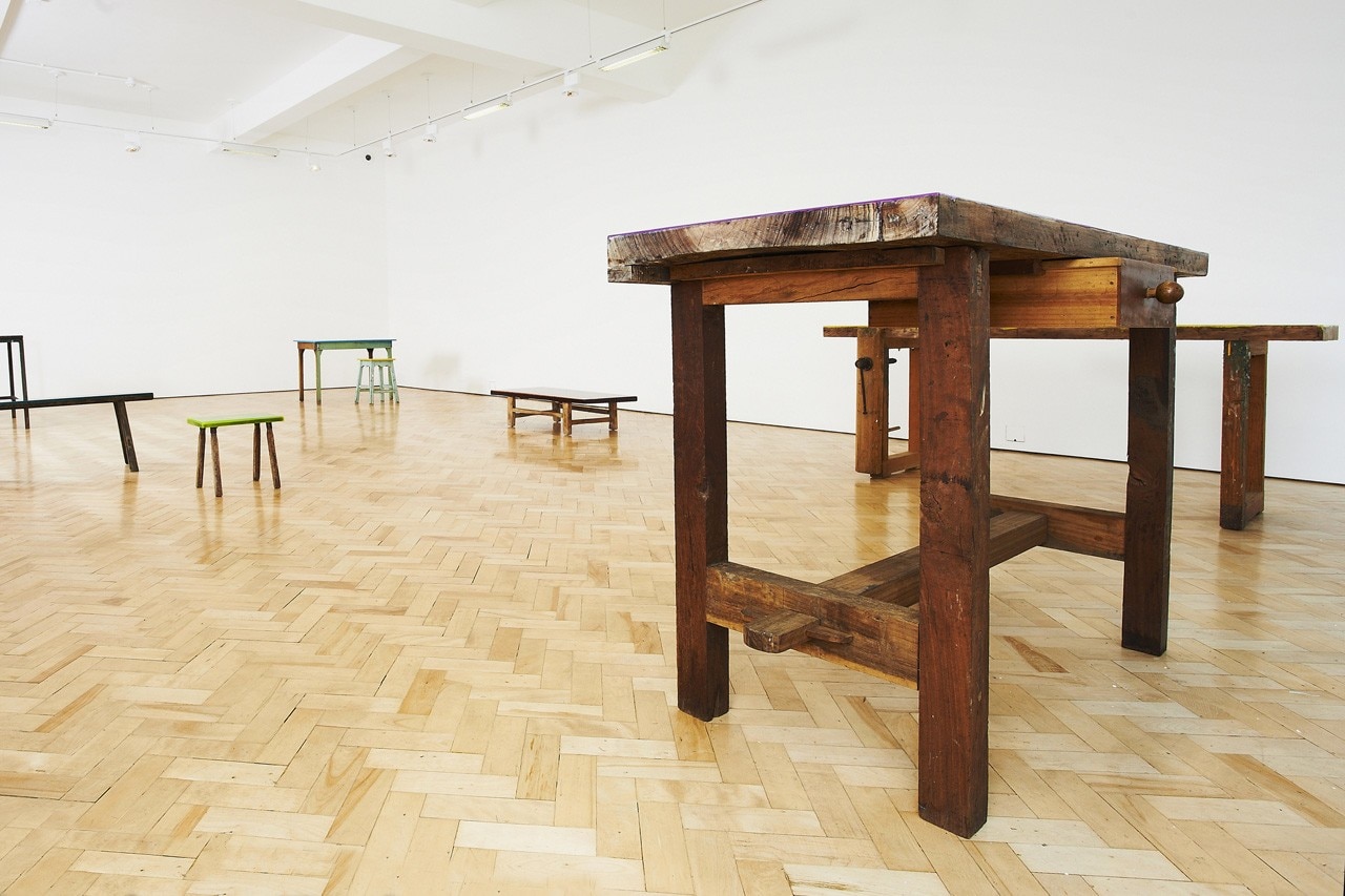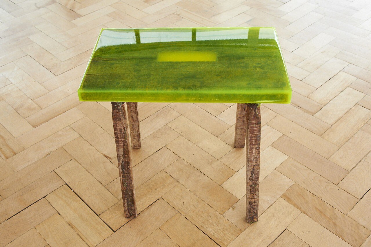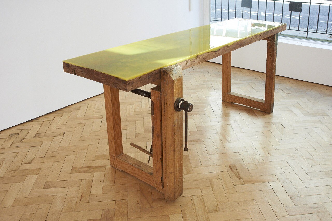 The series takes found workstations and tabletops which are renewed through a layer of coloured epoxy resin in order to reveal and celebrate the textures of the woods, their time-weathered surfaces and the many narratives embedded in these cuts, scratches and abrasions.