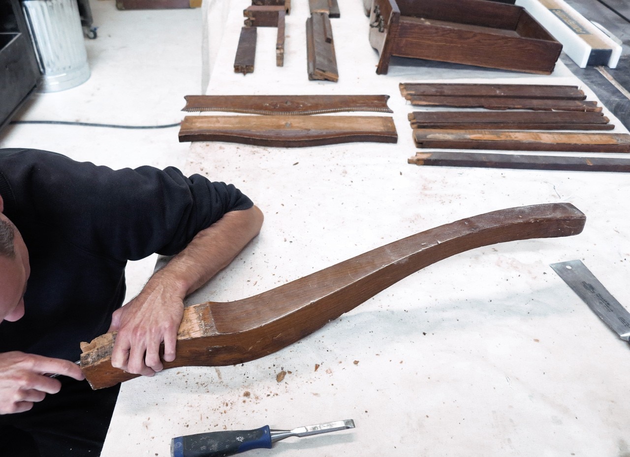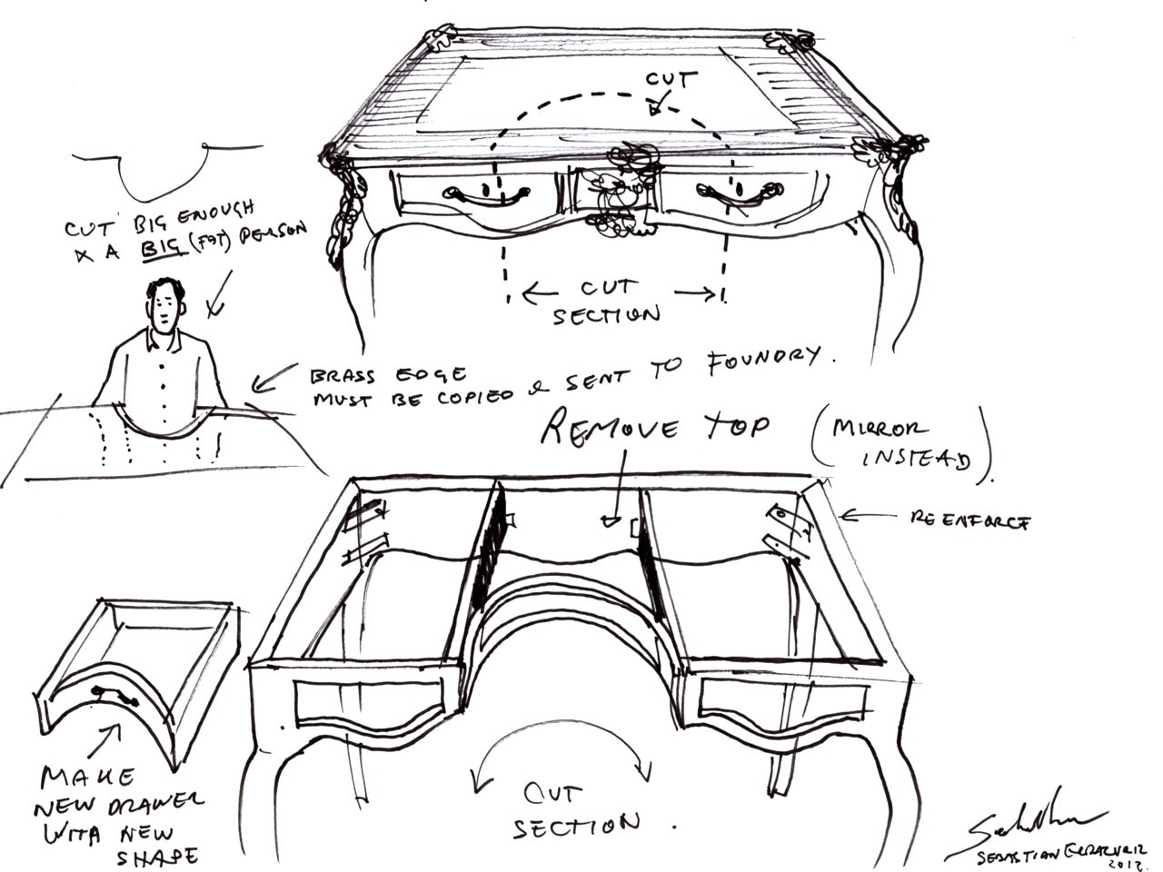 The desk wishes to offer the user a moment of reflection, a moment of thought at the one space where we make most of our important decisions in life. In order to fabricate the desk, Errazuriz found a broken down French Desk from circa 1880, which he then completely restored. He cut into the original desk with a semi circumference to allow the user to now fit inside the desk. The original top was replaced with a mirror.