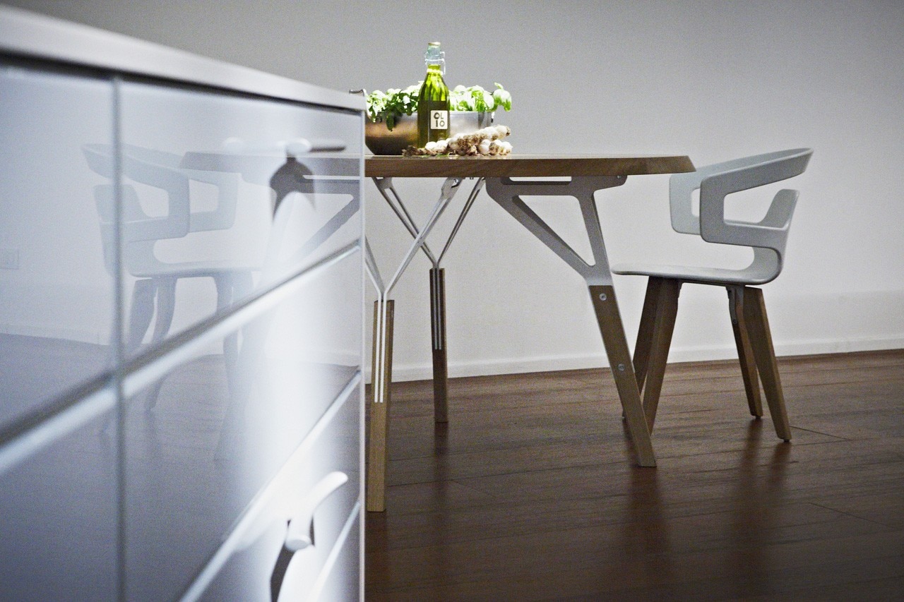 “The idea was to design a social, warm yet visually lightweight table. The type of construction (sheet metal and wood) has drawn its inspiration from the modern details of the carpentry crafts; the console and joist hangers made of plain steel have their sophisticated rebirth. Different colors of the metal parts provide the table with different characters.” said Häberli.