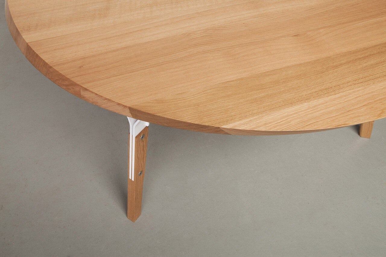 Häberli gave a subtle detail to the edge of the tabletop: the edges are not simply vertical, but their angles move outwards at both ends, while moving slightly inwards at the sides. This shape detail changes so naturally that you only notice it in a second instance. As a result, although the table top is perfectly round, the top appears to be slightly oval due to the changing table edge.