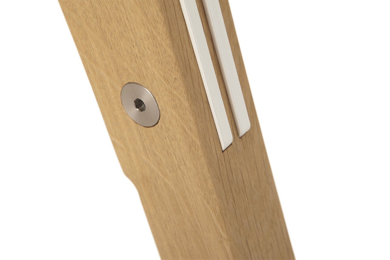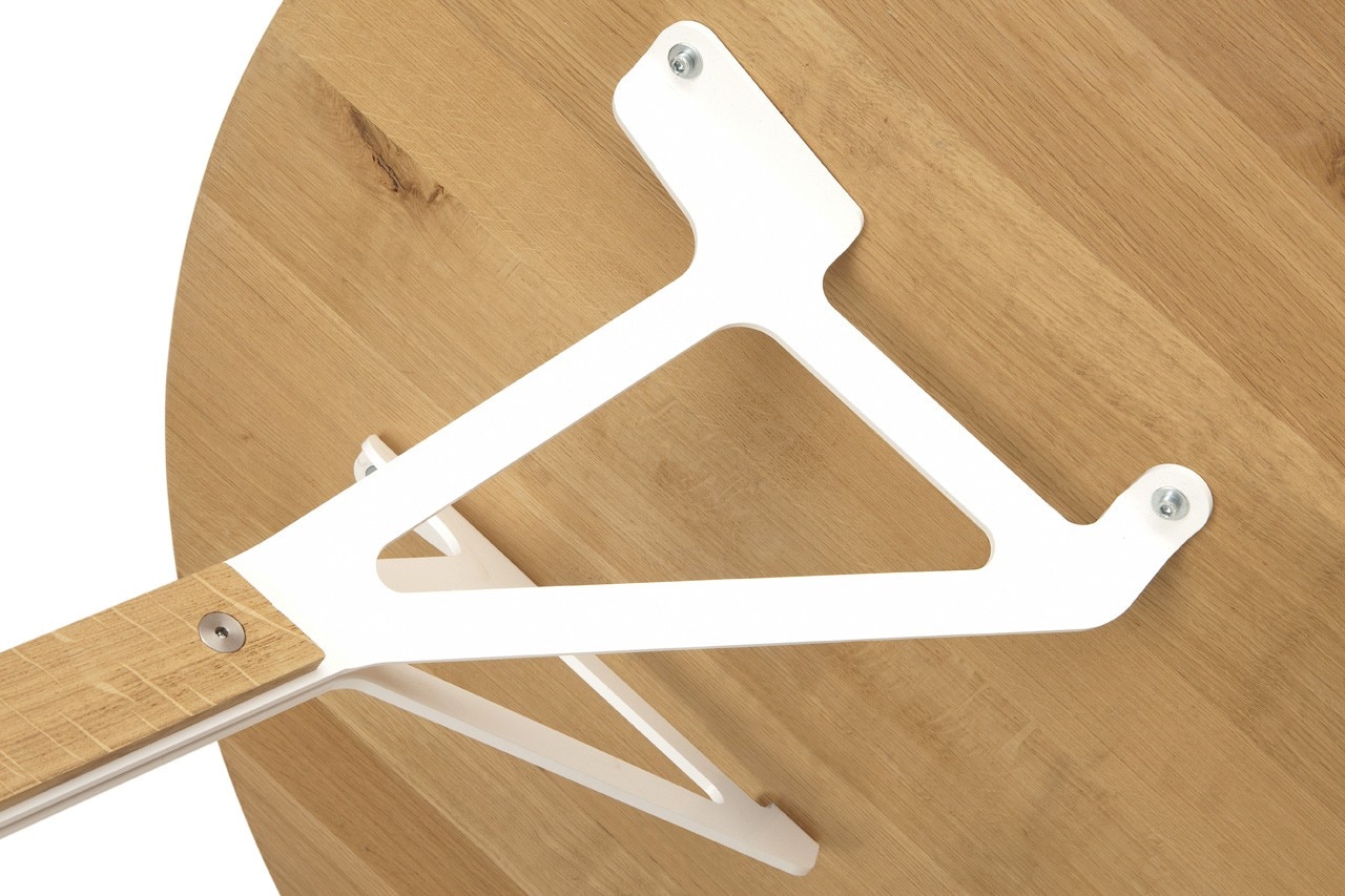 The round Stammtisch has a striking engineering construction of the chassis. The light wood and laser cut sheet steel feel sophisticated and familiar at the same time. The wooden legs are connected to the metal frame like the handgrip to a knife. Quoting this Swiss symbol par excellence – the knife – gives the table a recognizable and playful appearance.
