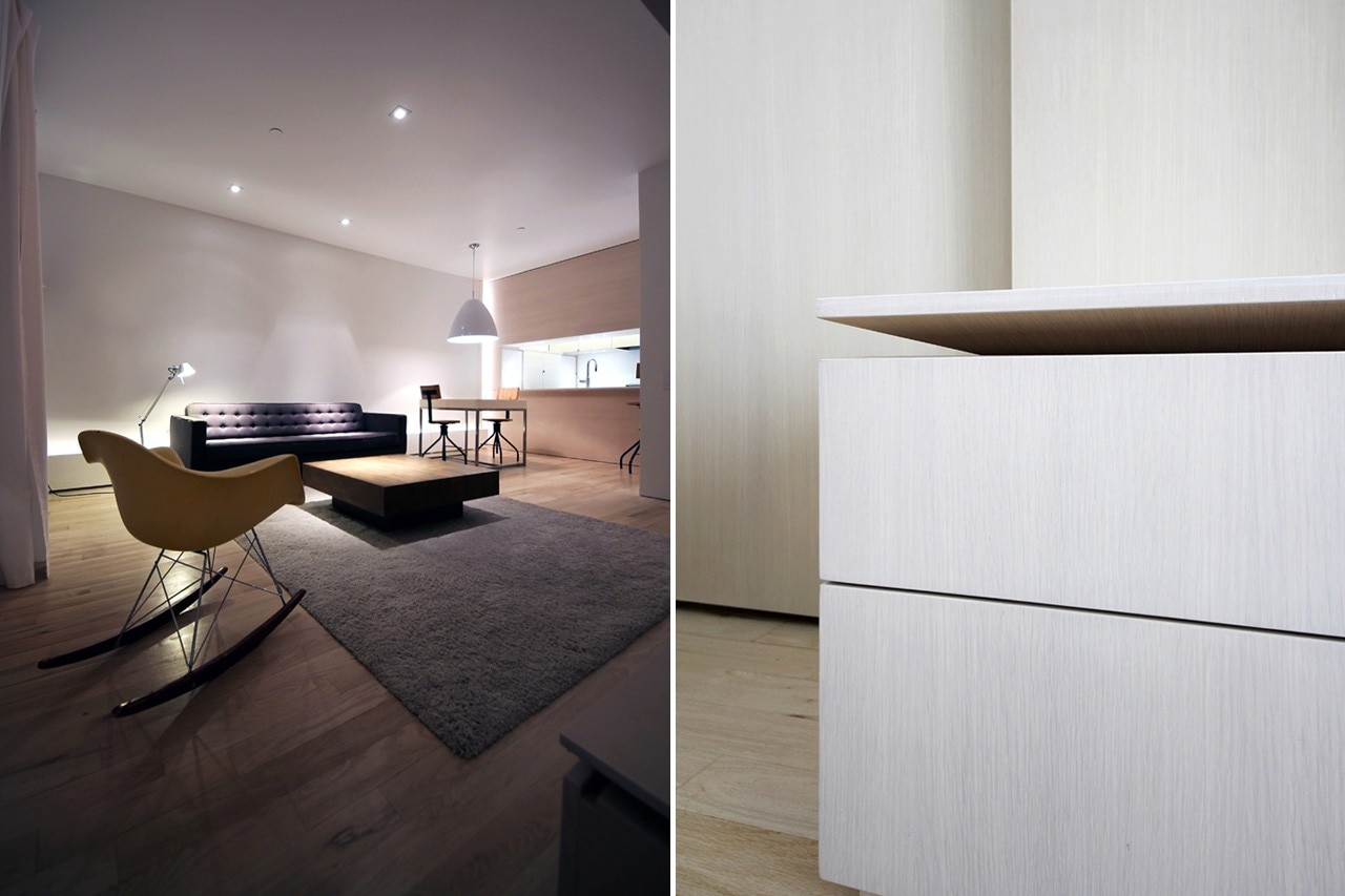 There are white-washed wood panel, bleached oak floor and white color for stone and wall throughout the apartment. It gives minimal, consistent and pure feeling of the space. Tapered and slim edge details are also consistent detail elements to emphasize minimal and sensitive design expression. Wood base, vanity mirror frame, window trim, book shelf and kitchen counter have tapered shape.