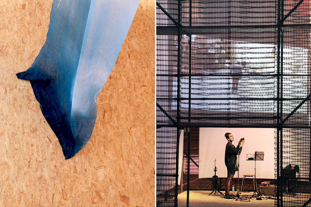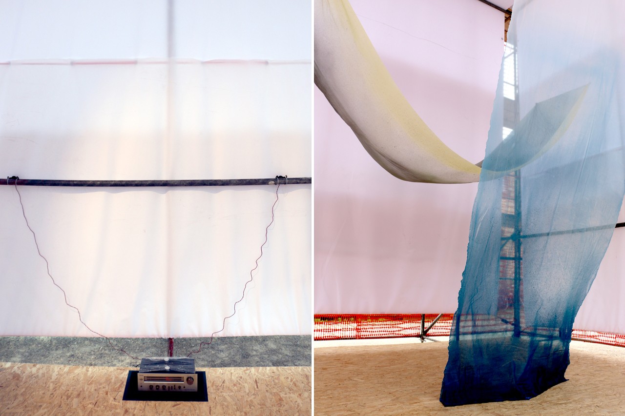 Left: Studio Osk, Stadtumbau, Berlin. Luca Forcucci, M(a)(e)rgin(g)s, installation – sound. Right: Studio Osk, Stadtumbau, Berlin. Natacha Mankowski (France), Flat Spaces, installation, silk