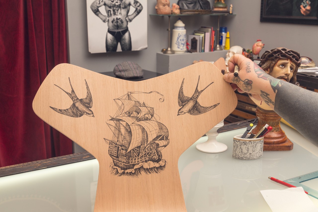The inervention of the two artists, which underlines and characterises the identity of each chair with reference to places, memories and surreal and fantastic dreams. All these elements are part of Sedda’s fantasy, linked to the past and nostalgia, and they depict a present which has been and will never be again, like in novels where a sad feeling permeates the whole story.