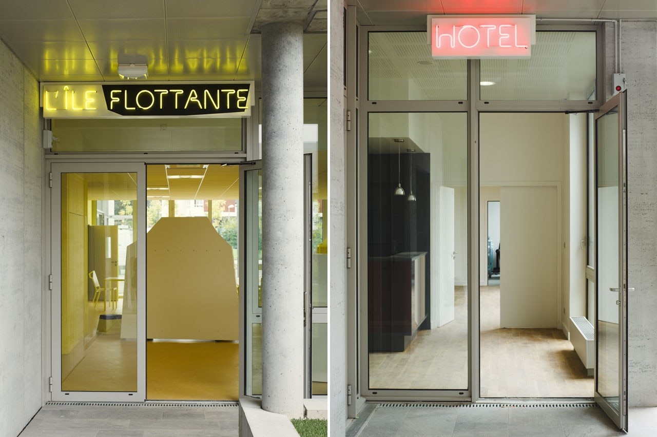 This project is entitled Île Flottante in reference to the internationally-loved dessert, which gives it this specific shape, colour and simultaneously its identity which furthermore boasts a logo and outdoor lit signs.