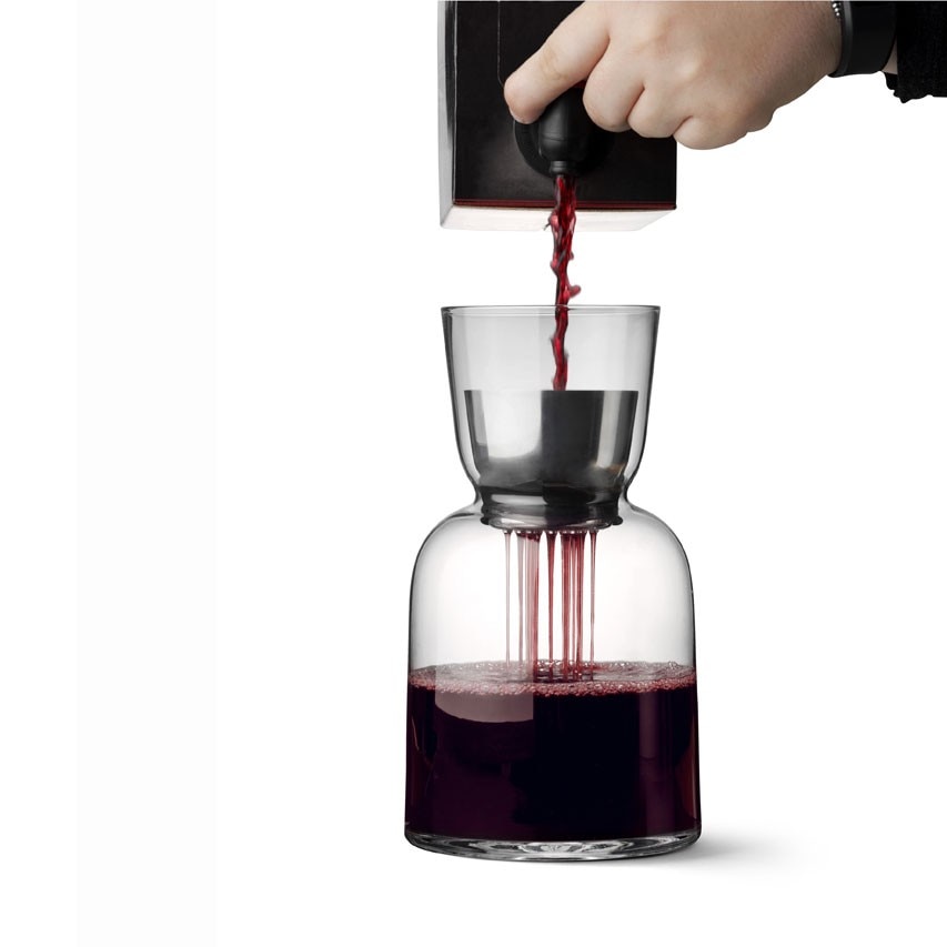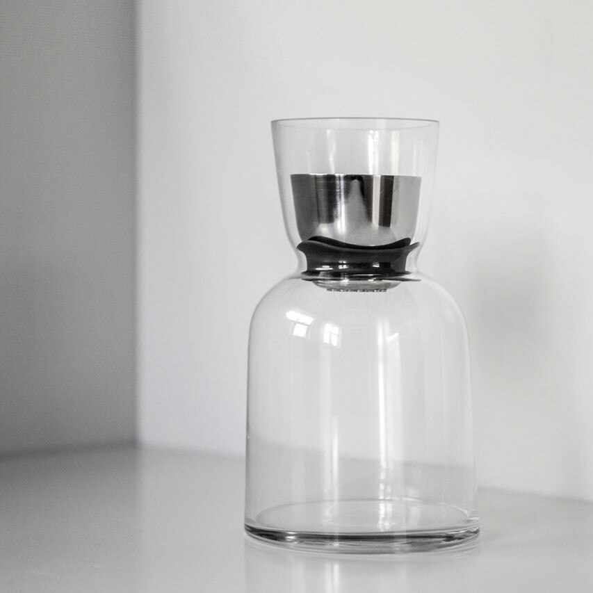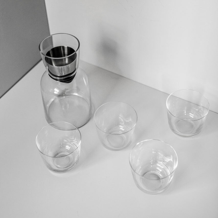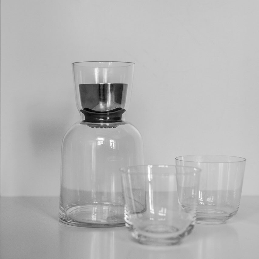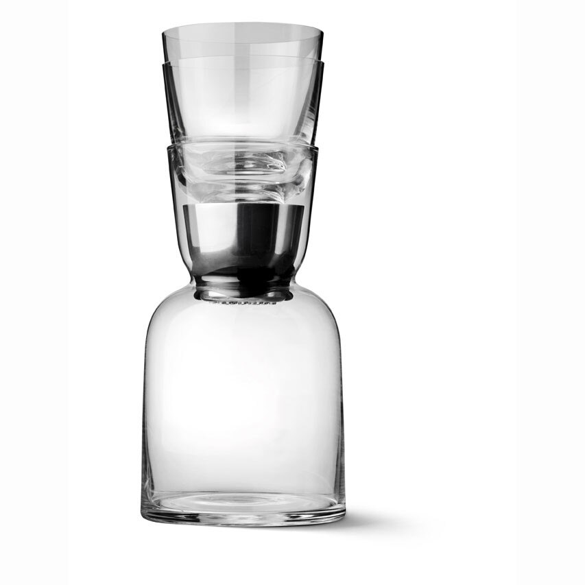 The WW carafe is crafted from mouth-blown glass with an injection-moulded silicon seal that is friction-fitted over a Danish-made stainless steel ‘breather’ component. The set of four mouth-blown glasses stack inside the neck of the carafe for easy storage and transportation to the table.