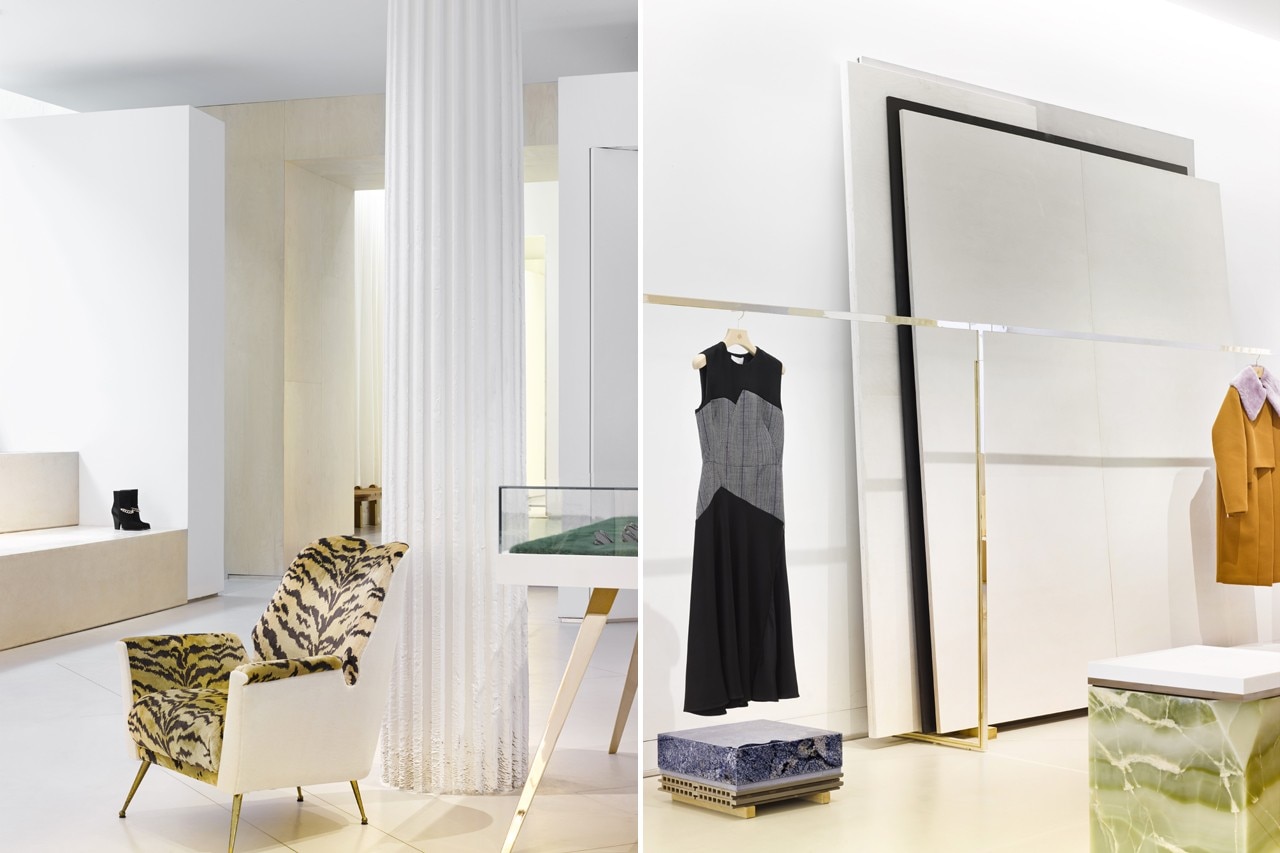 Collections are displayed on bespoke designed fittings echoing the casual elegance of the brand. Minimalist metal rails in champagne gold finish, and white Corian and mint-hued marble tables compliment the 3.1 Phillip Lim range. Plinths to display accessories make playful use of utilitarian materials with ordinary floor tiles stacked high, and interspersed with pieces of glass giving a glint of blue.