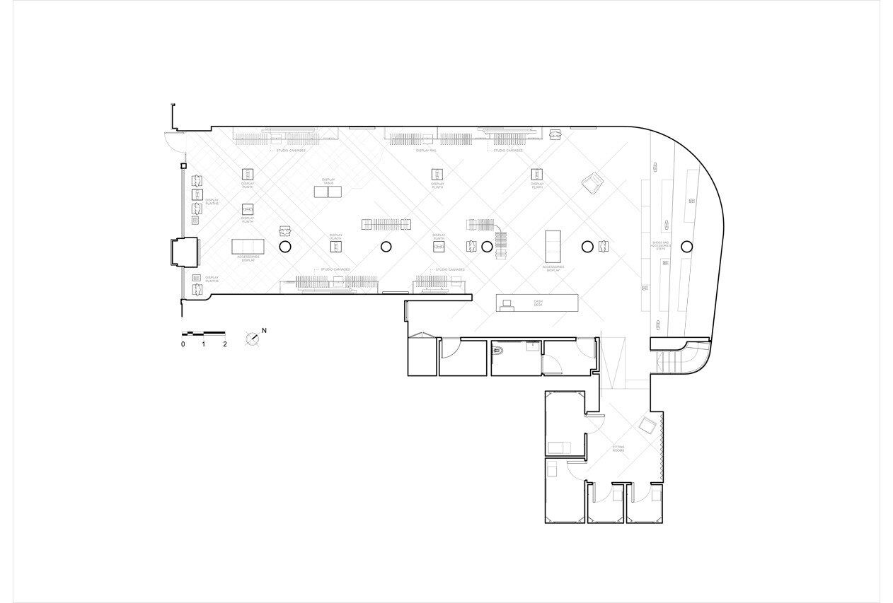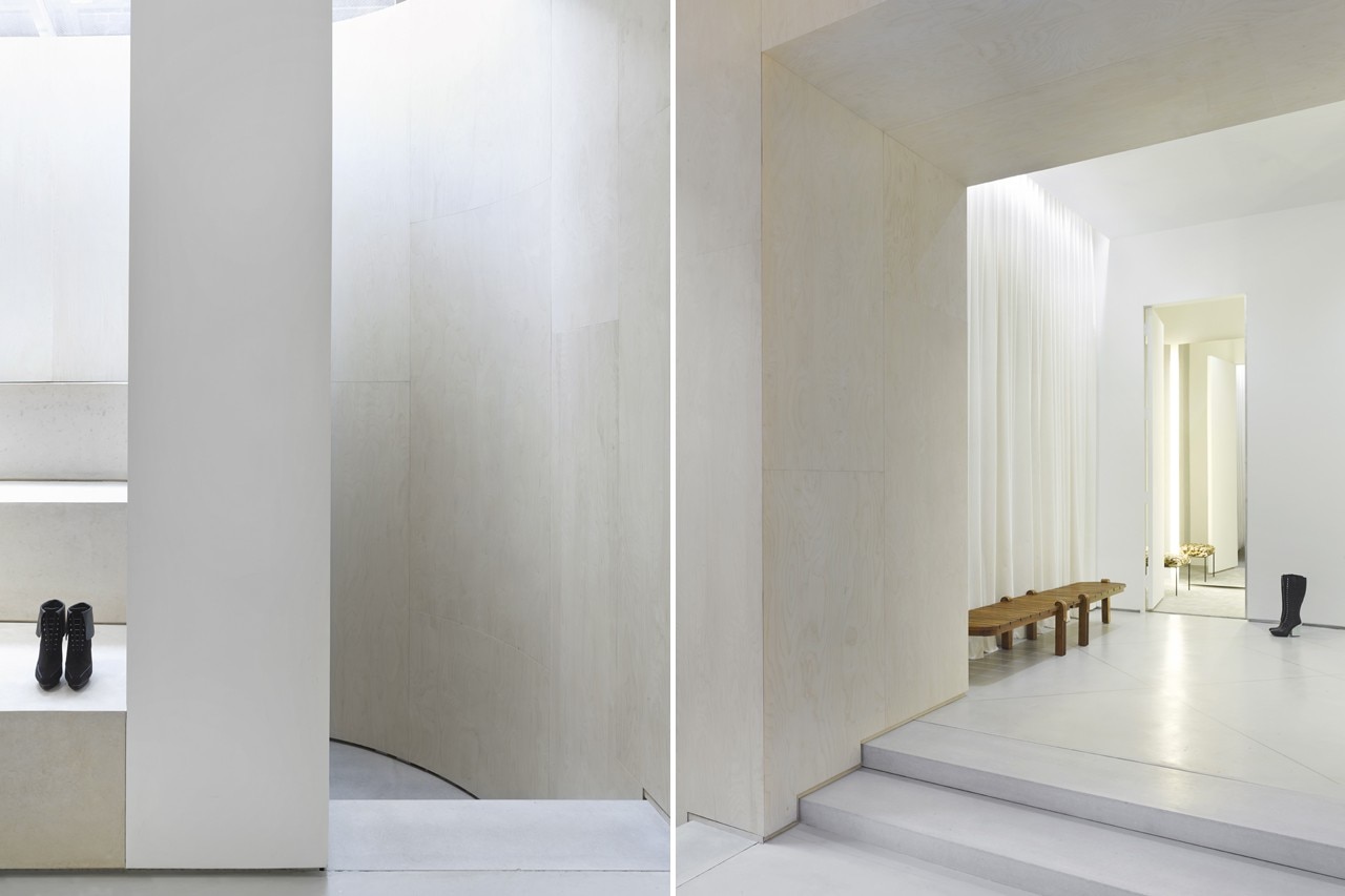 Key architectural features include a curving, white washed plywood wall and oversized stone steps along the back of the store. Lit with abundant natural light from the skylight above, the steps display shoes and accessories in addition to providing a platform for installations and performances. A freestanding minimalist architectural block, inserted into half the length of the store creates space to house fitting rooms.
