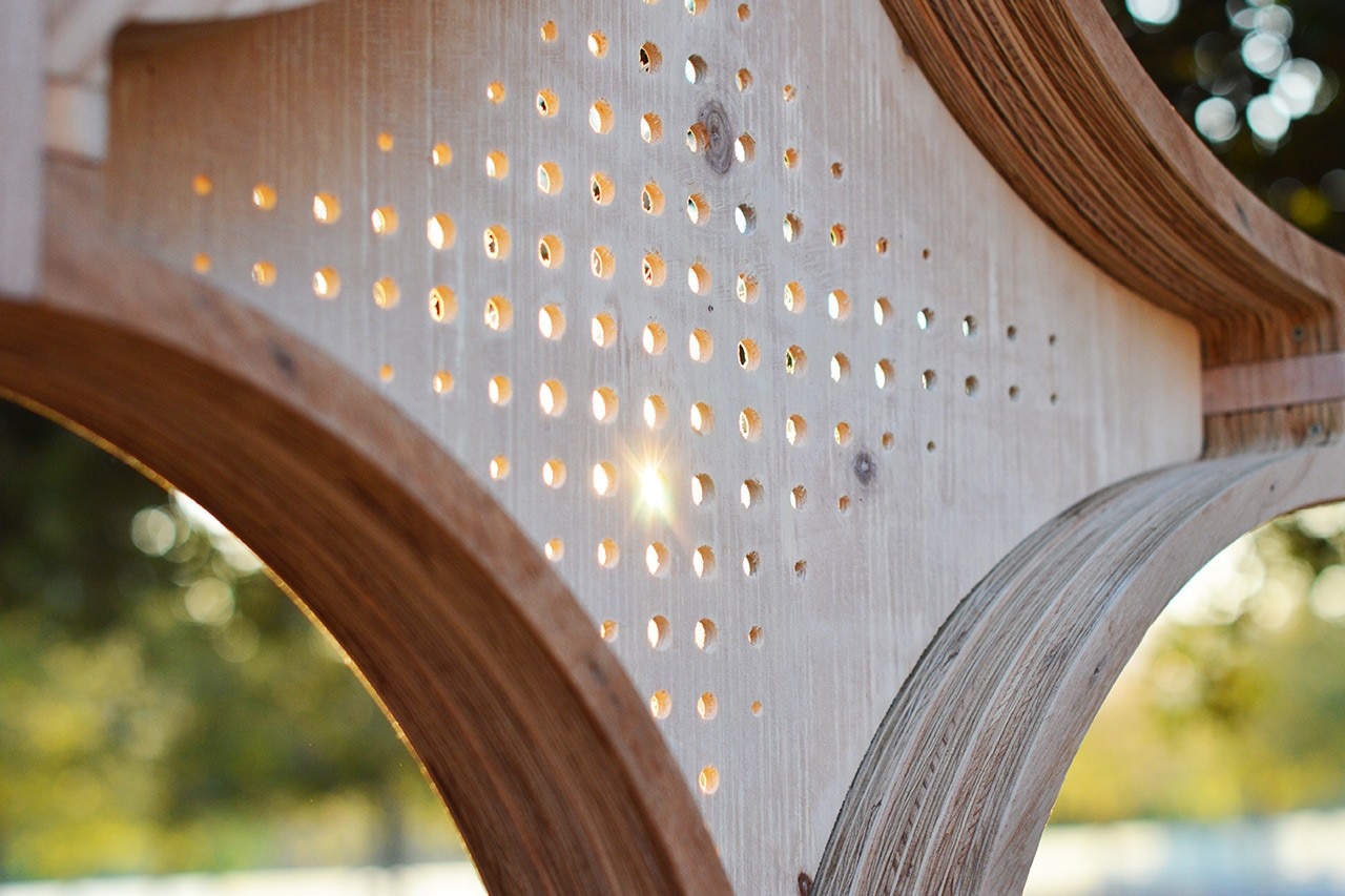 Wunderbugs can assume infinite configurations thanks to its modularity realized through the careful combination of 1104 arc modules, 92 rhombuses which allow to alternate and adjust the pavilion’s fullness or emptiness, and 198 knobs in wood that regulate the circular or curvilinear progress.