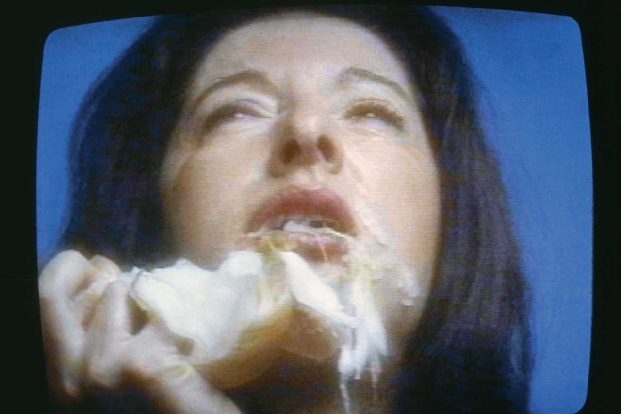 “An open hand for giving and receiving.”, as taught by Le Corbusier. One can also discover a woman concentrating on eating an onion (Marina Abramović, The Onion, 1995), a pseudodeclarative performance about physical and psychological endurance, but also on human vulnerability, identity and the independence of women, notably when the artist’s voice speaks of feeling worn out by her everyday life: “I’m tired of changing planes all the time, waiting in waiting rooms, bus stations, airports...”