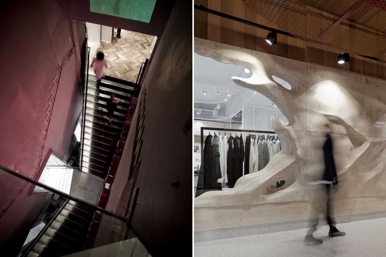 At the main entrance, one is welcomed through a 25 meter long frieze of pinewood, telling the story about the 12 rivers coming together in Ginnungagap. The first floor is a tale of ice from Niflheim, with a cold palette, putting focus on product display and highlighting of special elements. From the first floor, one is guided further up in the Universe with the staircase – or more accurately put; a 12 meter tall art space with a transparent glass bridge on top where one can view three floors down.