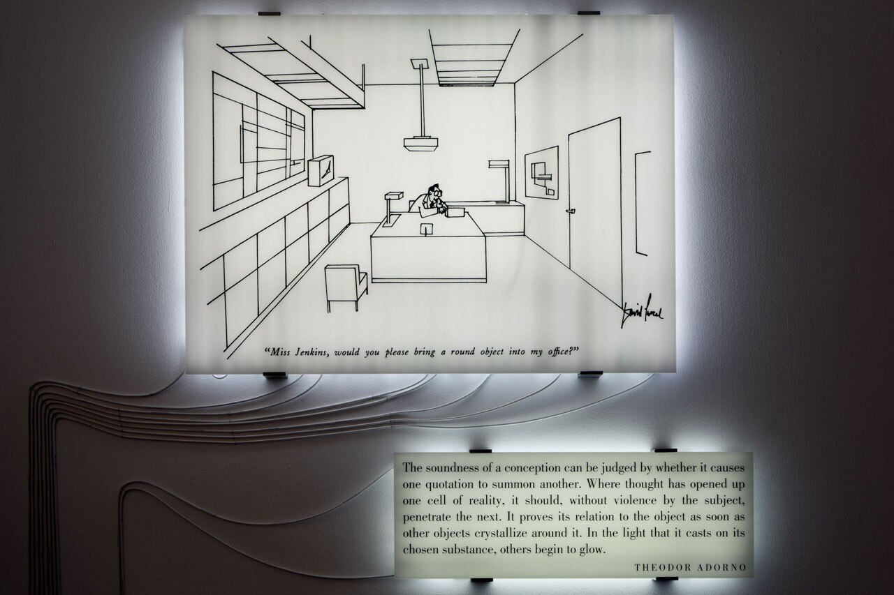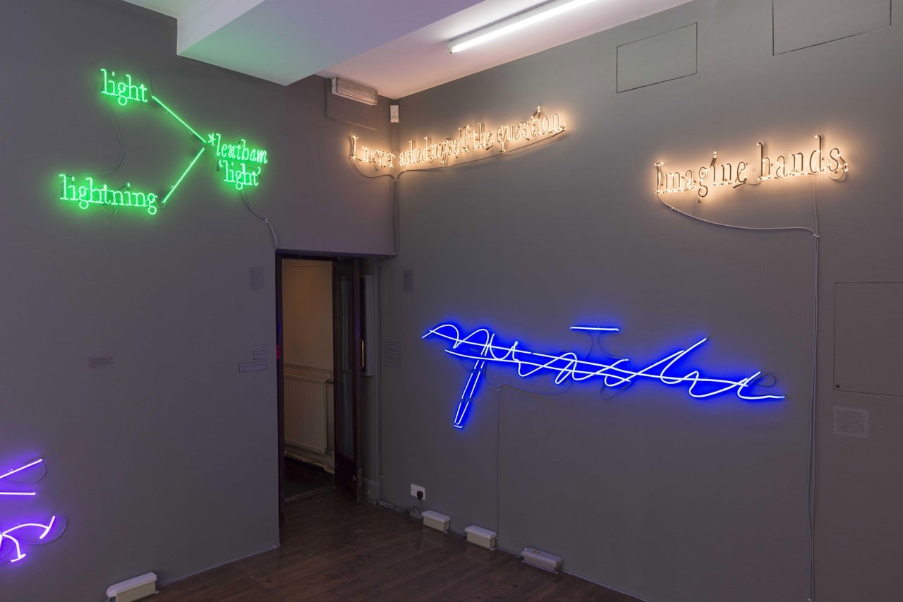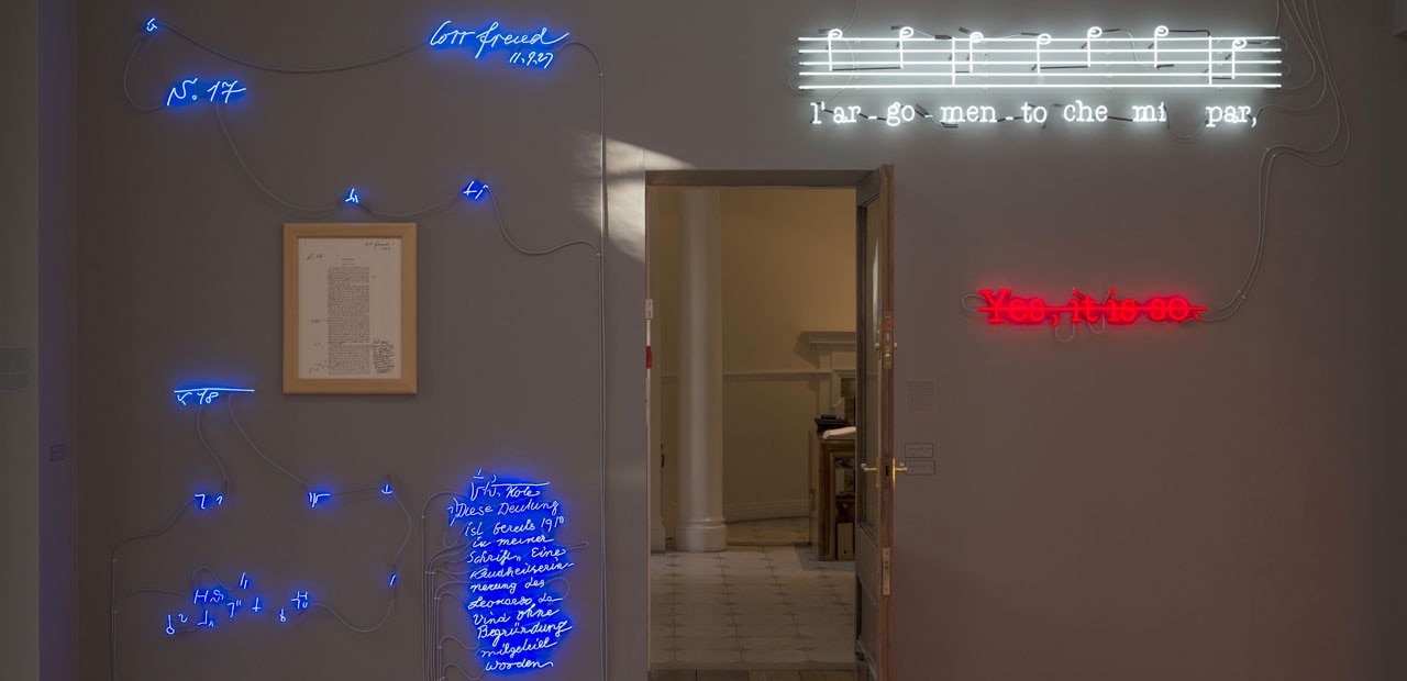 Kosuth extricates the corrections, converting them into cobalt blue neon and mounting them together on the wall around the framed proof, highlighting how writing is studied and converted into artefacts, and from artefacts to art. Three works from the recent Beckett series (2011) will also be exhibited. Fabricated in warm white neon with the facing side dipped in black paint, Kosuth uses fragments from two of Beckett’s works: the renowned Waiting for Godot and the lesser-known Texts for Nothing. The playwright and artist share an interest in how language can conceal and reveal meaning in the act of constructing new meaning; while Beckett approaches the question of meaning by investigating its absence, or the impossibility of meaning revealing itself through language, Kosuth asserts its presence by posing questions about how meaning is produced, by both artist and viewer.