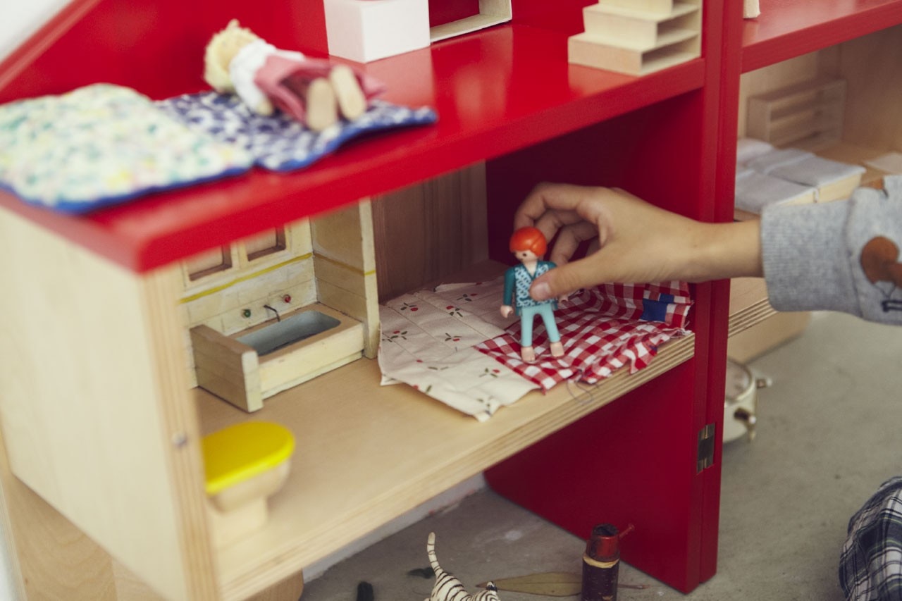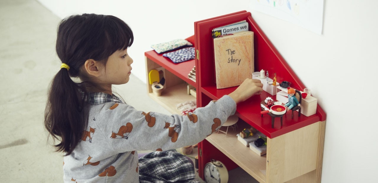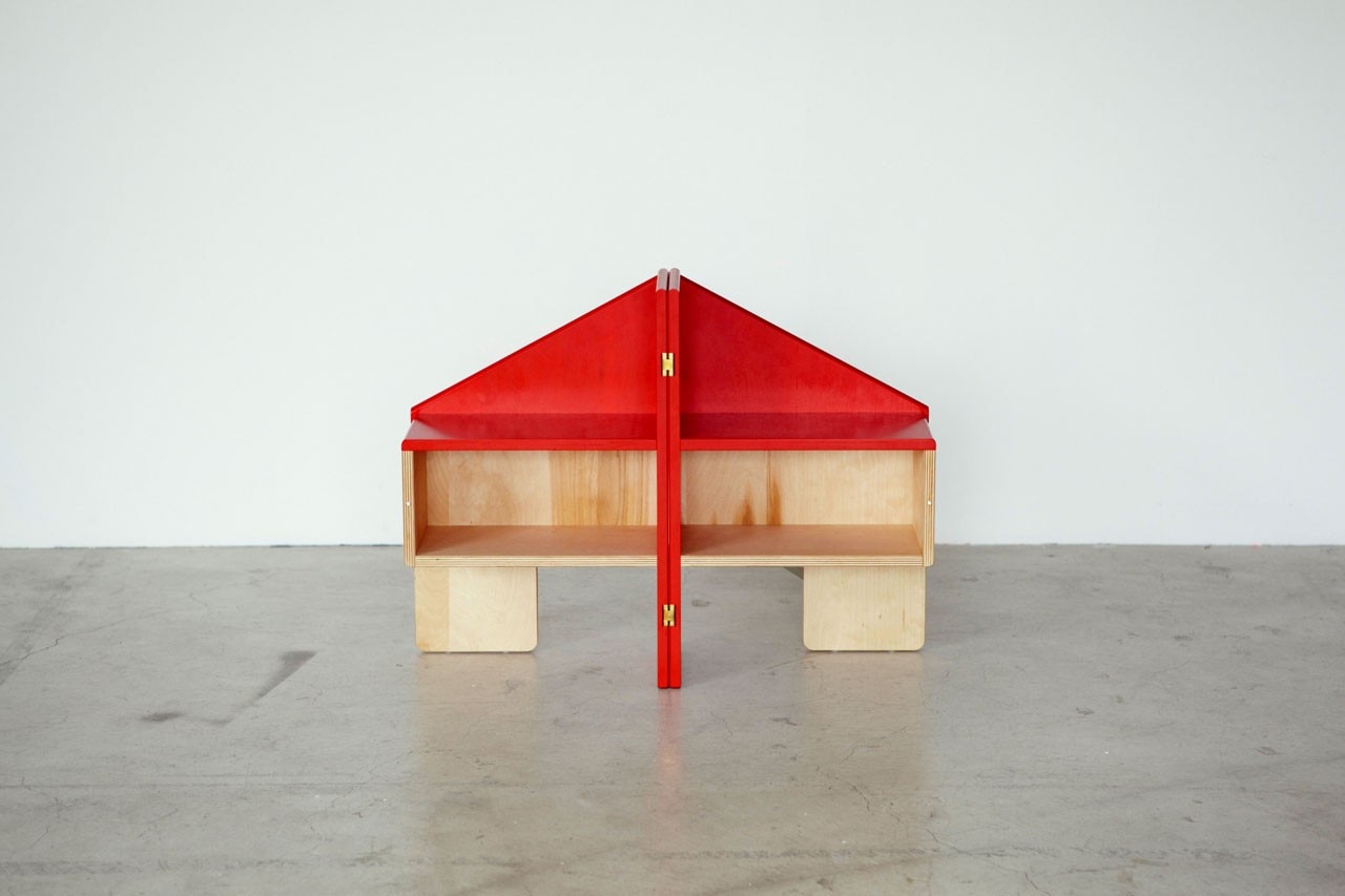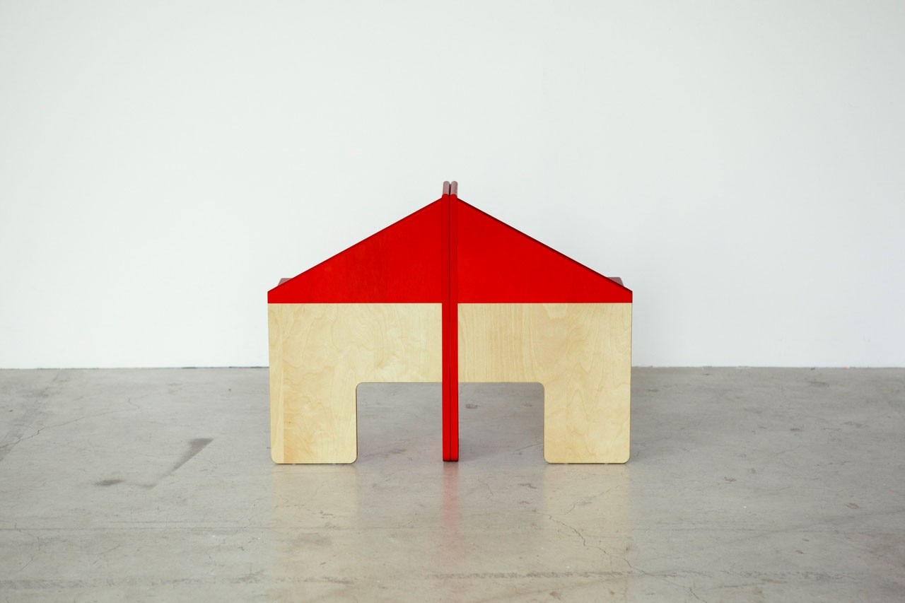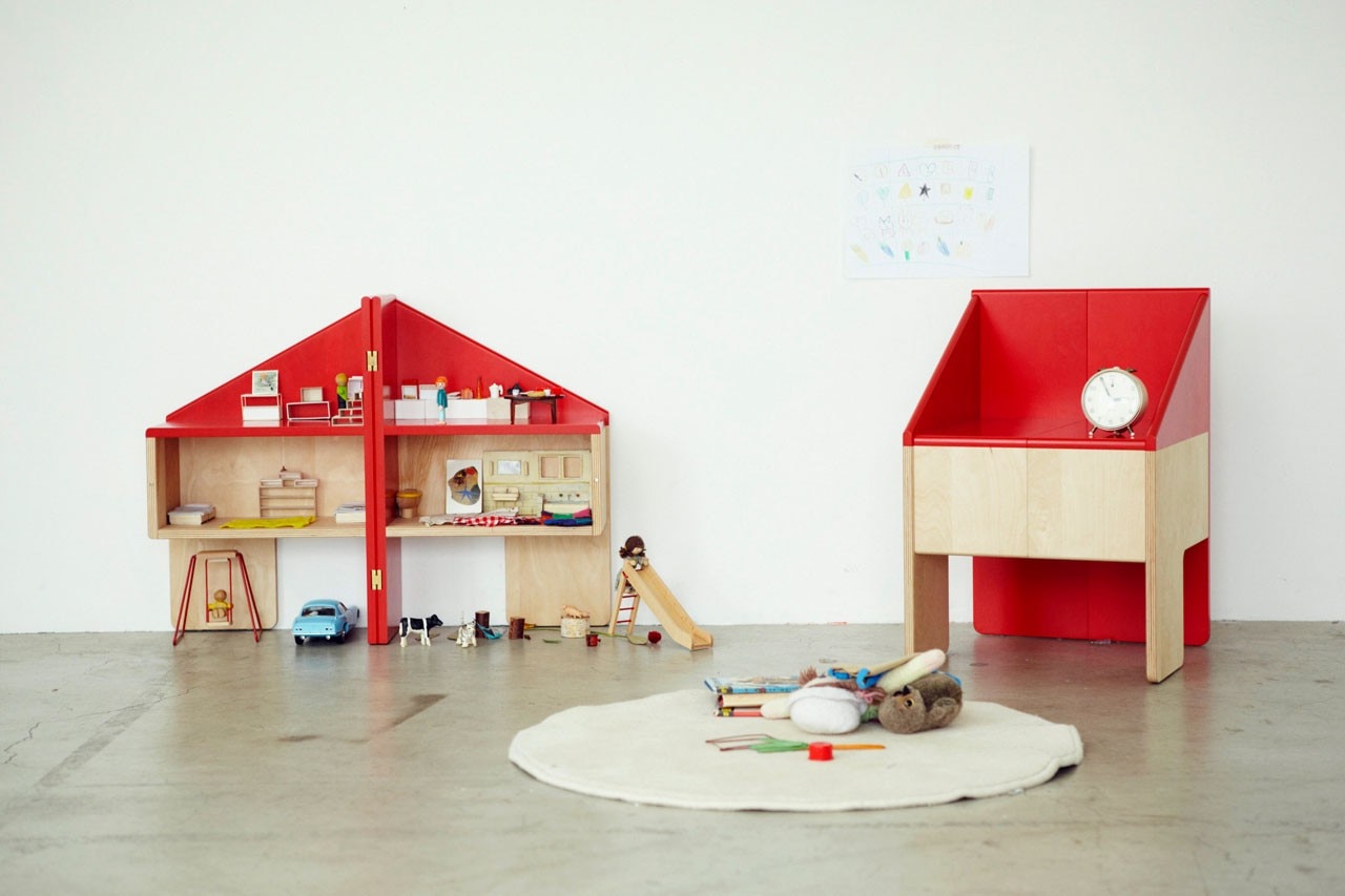 Torafu Architects designed for Ichiro a piece of furniture for kids, that can be a chair but also a dollhouse with a red roof and a storage.
