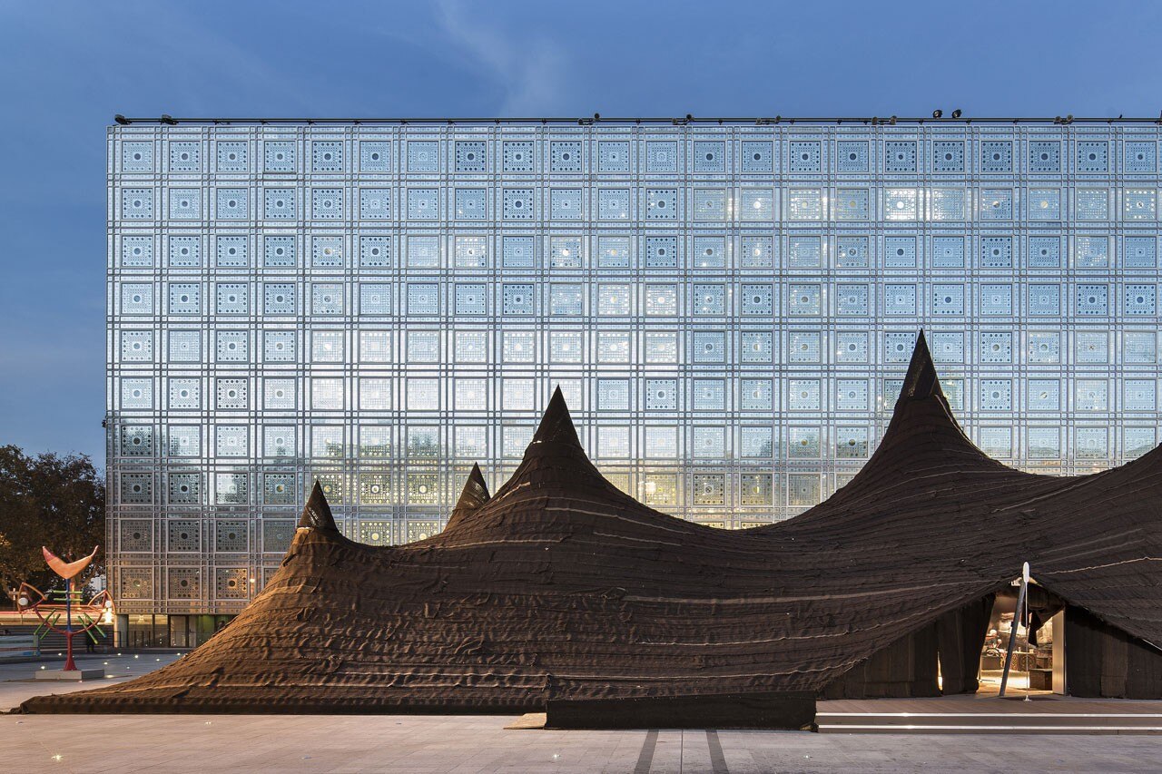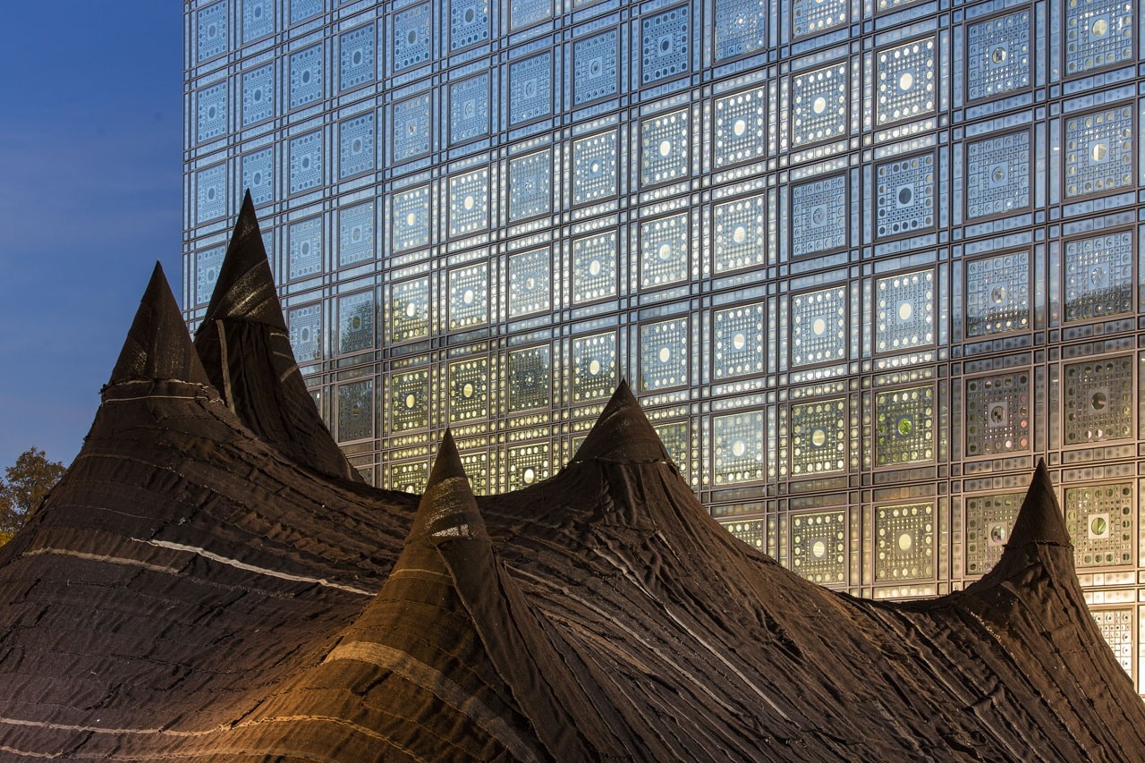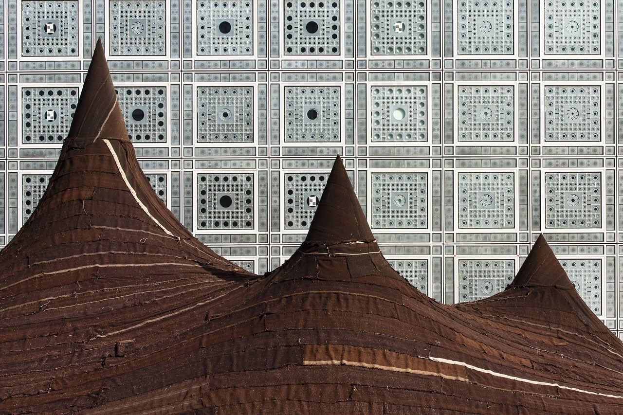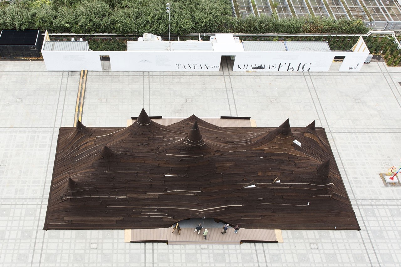 Constructed from more than 650 sqm of camel and goat wool woven by female cooperatives in the Saharan desert, the tent serves as an urban landmark and a symbol for the “Contemporary Morocco” exhibit. The rhythm and scale of the tent’s silhouette renders a topographic dimension to the structure which pays homage to the nomadic traditions of southern Morocco.