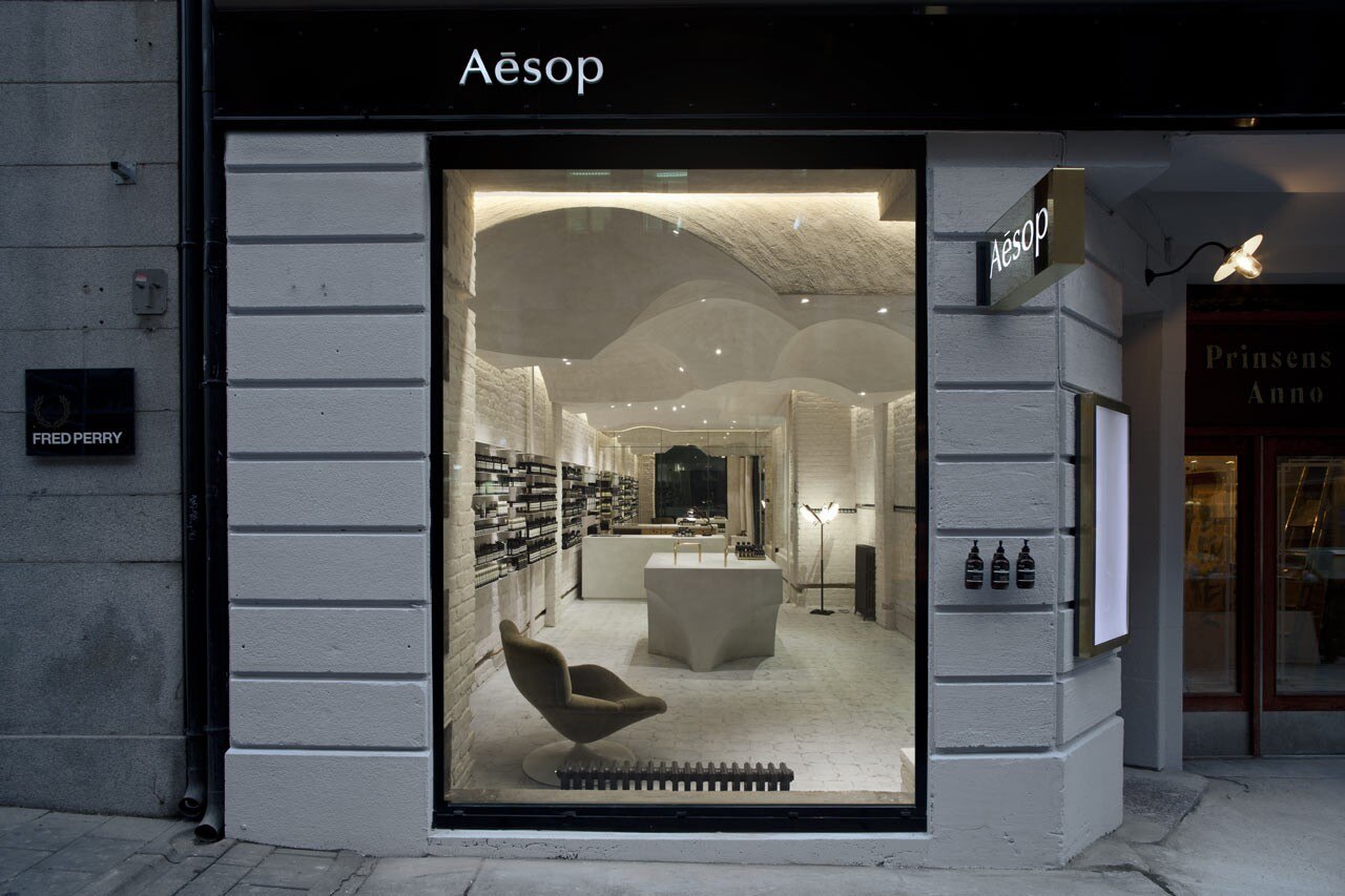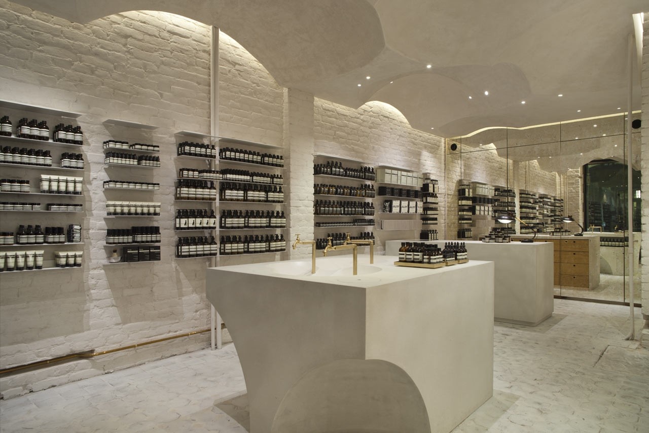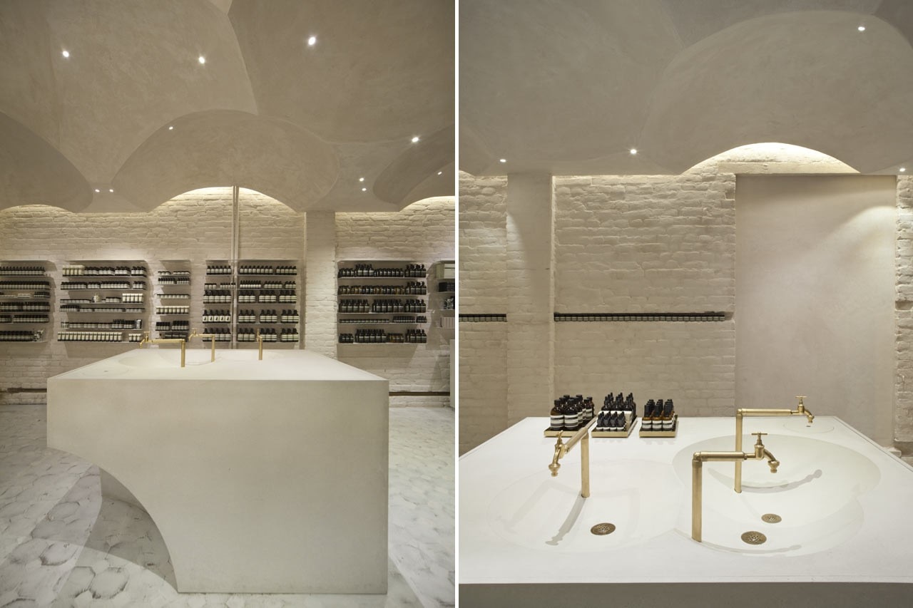 Original floor tiles are treated with a warm, pale finish to effect a cloudy surface that compliments restored and whitewashed walls. The products themselves are evenly exhibited on simple shelves and discreet horizontal niches. The products play the part of supporting actors where the customer is the lead. Brass taps and fixtures contrast the predominantly monochromatic palette.