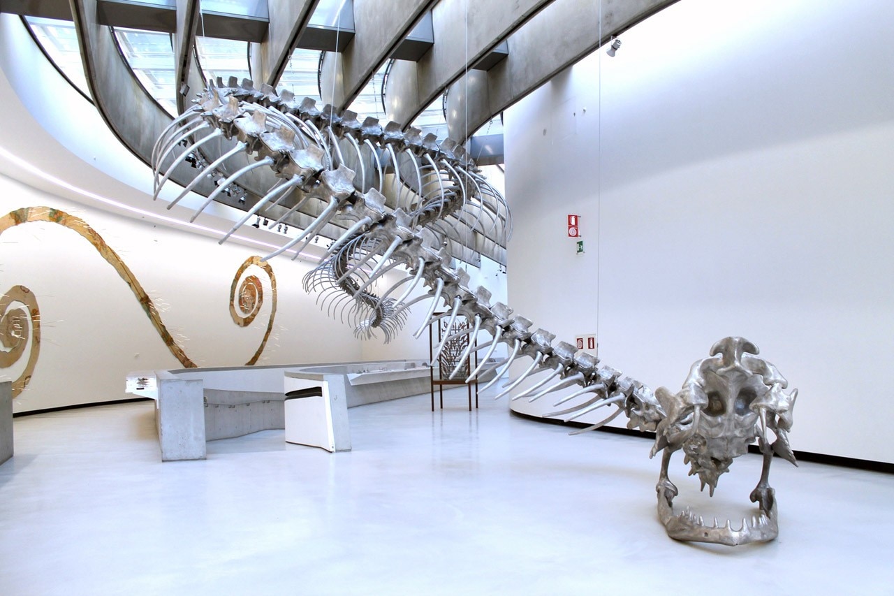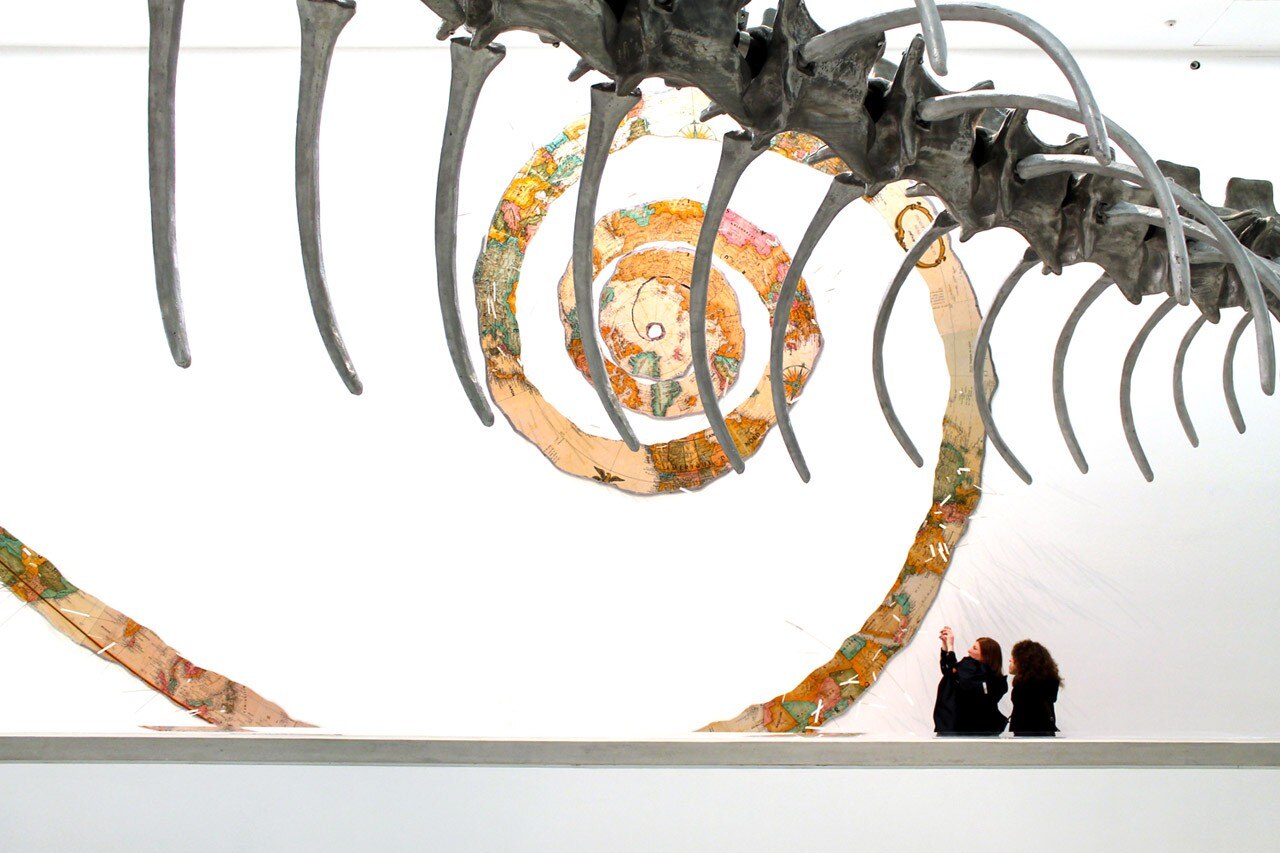 And again Bugarach (2012) a great stone emerging from the floor that is a miniature representation of the mountain of Bugarach in France, the symbolic site of esoteric tourism, believed in 2012 to be the only place in which one could find refuge from the apocalypse predicted by the Maya; Bâton de Serpent (2007), a monumental work that represents the skeleton of a gigantic aluminum serpent inspired by both Chinese and pagan mythology, as well as by the Christian religion, which the artist presents at the MAXXI in a version that is about 30 meters long. Religious references also characterize works such as La chaise à prière (2010), an overturned chair featuring a biblical verse from the Book of Jacob, and Camel (2012) a taxidermied camel whose side bears a verse from the Gospel According to Saint Matthew, while 92 bras de Guanyin (2014), a bottle drainer, reminiscent of Marcel Duchamp’s bottle rack, featuring many human arms holding various objects, is a clear allusion to the Indian goddess Kali.