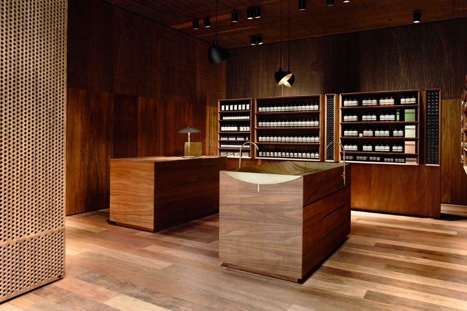 A custom solution of fitted supporting brackets was created to mount all fixtures in the tailored made perforated wooden ceiling, giving the space a clear, clean finish. This unique intervention brings to light both the purity of the wood and the unmatched Aesop products.