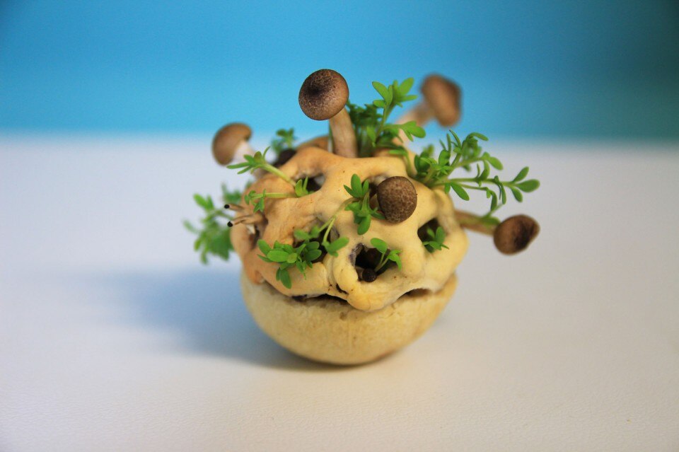 Within five days the plants and fungi mature while the yeast ferments the solid inside into a liquid. The product’s intensifying structure, scent and taste are reflected in its changing appearance. Depending on the preferred intensity, the consumer decides when to harvest and enjoy the delicious, fresh and nutrient‐rich edible.