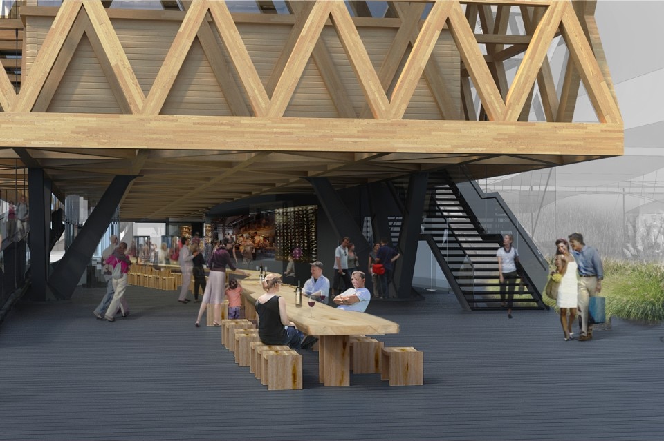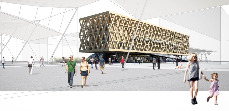 The large wooden structure, accessible by a central ramp, hosts an array of art works at its very center: photography, video, multimedia, graphics, furniture and sculptures. A tunnel surrounded by twenty-four synchronized projectors immerse visitors in a virtual reality experience, on a fishing boat at sea or in the vineyards of Carmenere.
