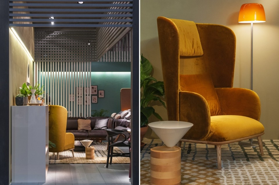 The stand at the exposition reproduces a domestic space subdivided into environments, as if they were rooms of a home.