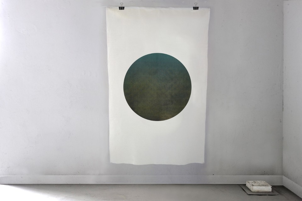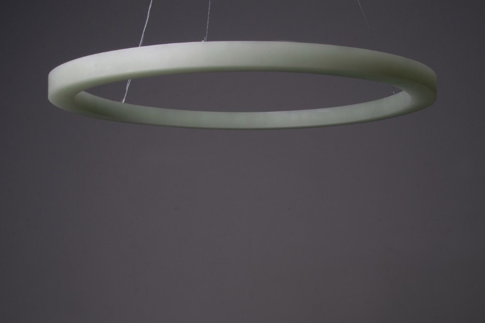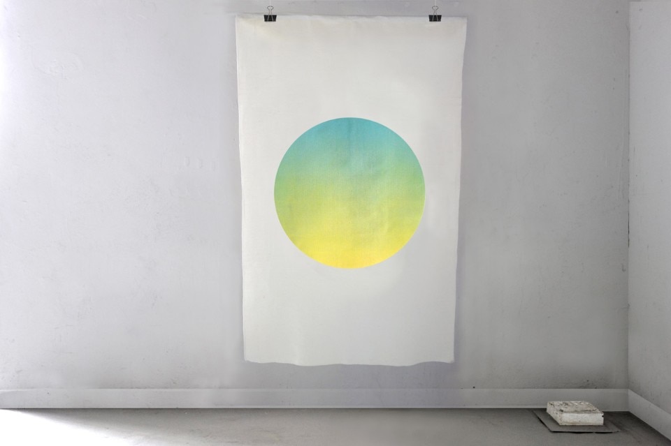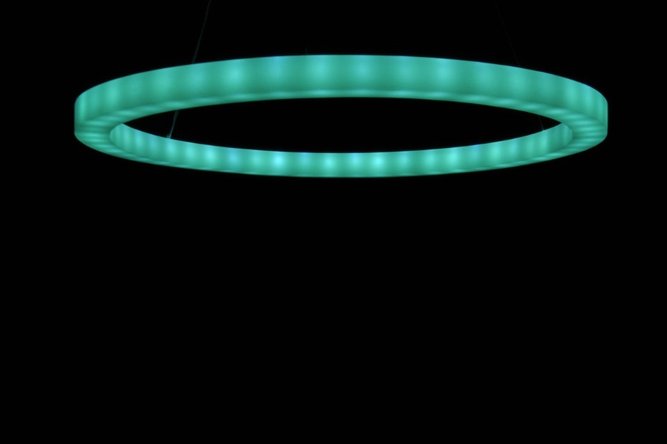 Each product is made with a combination of smart materials and base materials, for instance the mirror is made of thermochromic pigment mixed with epoxy resin cast on a copper plate, the ring lamp is made of polyurethane resin mixed with phosphorescent pigment and small UV LEDs cast inside, and the textile uses thermochromic pigment mixed with base inks screen printed onto the surface. The colour changes happen as a result of different stimuli, either heat or UV light. All of the objects are connected by Wifi, so the pieces can be completely separate from each other and when one piece is triggered the other piece will react somewhere else.