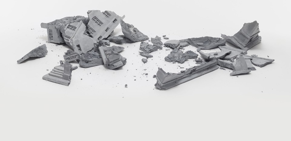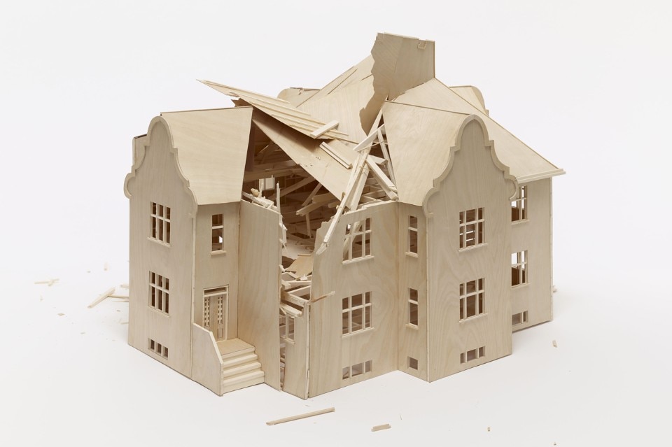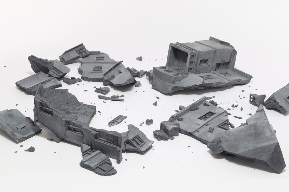 procedure of redrafting to create models that are then destroyed by various means only to be reconstructed from the remains. The eroded structures evince a history imagined through a process as rehearsed and anticipated as it is left to chance.