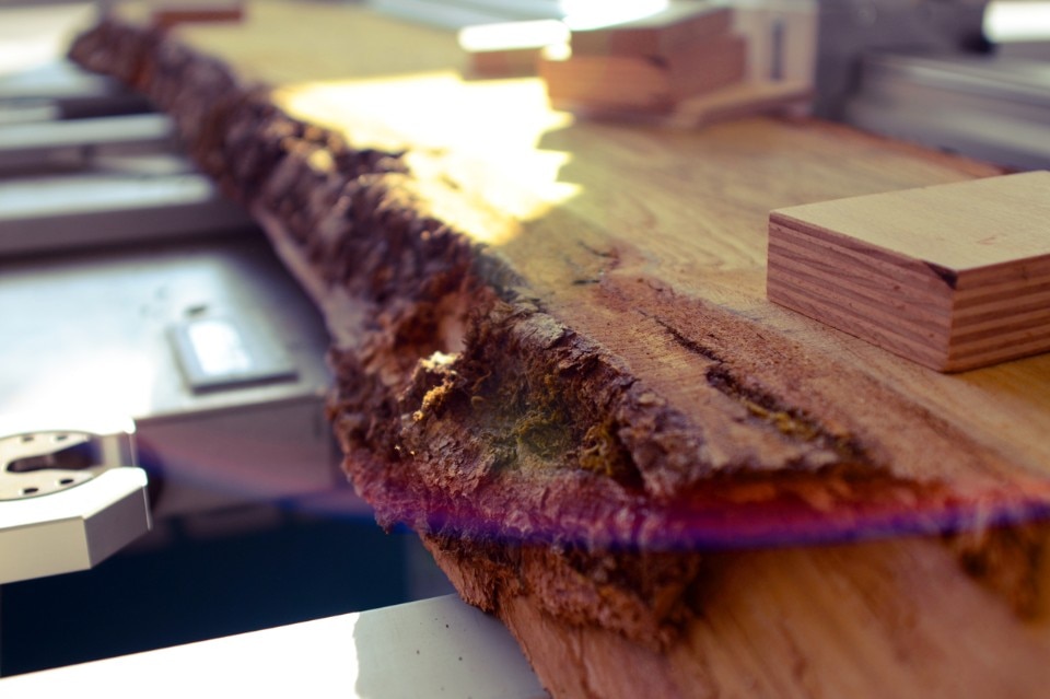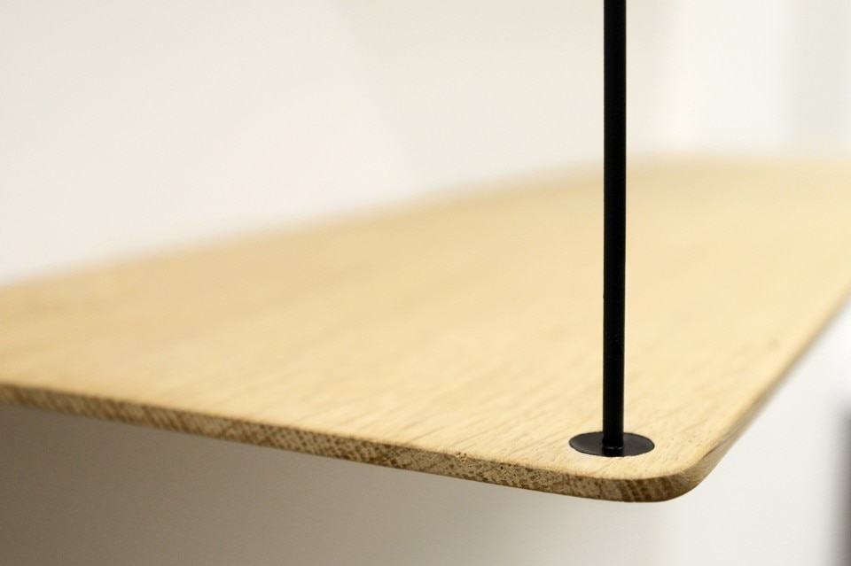 The form of the shelf makes it look very delicate, because most of the time you only see the 4mm wide framed edge. Its stability comes from the sideways positioned steel wire, which