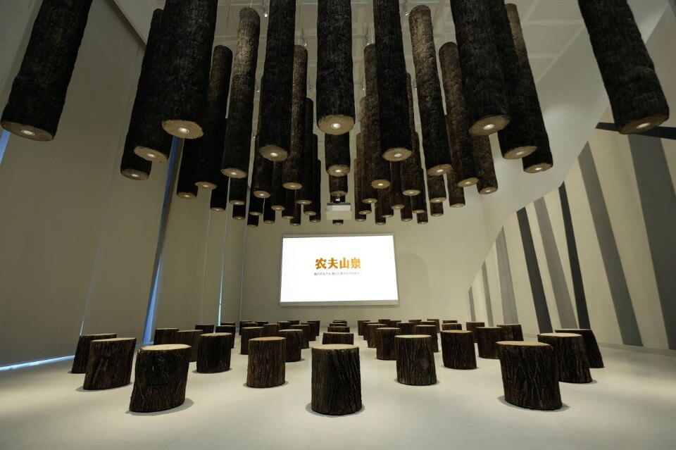 At the end of the tour through the centre, there are three spaces providing supplementary information and more detailed insights into the background of the factory’s location. The central space is dedicated to the biodiversity of the Changbai Mountain Range, namely to the basis for the excellent quality of the water sold by the company. It is accompanied by a laboratory in which visitors themselves can test and interactively compare the water’s specific qualities. There is also a Contributors’ Lounge in which all those involved in the project are introduced, whereby the items of seating furniture are reminiscent of water cartons.