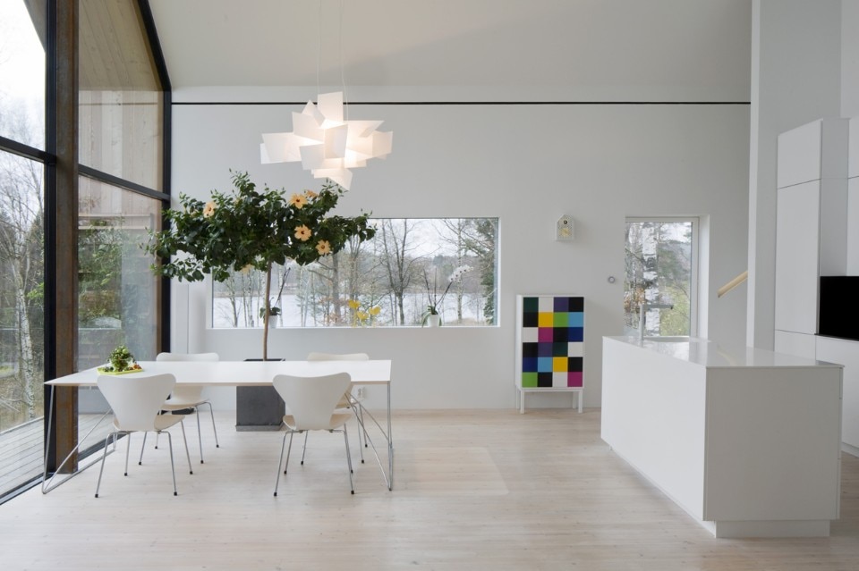 When inside you will experience the breathtaking view as the building is opening up. In “the church” you find the kitchen where you have a panoramic view of the lake and the forest. The minimalistic interior is seamless and white with black details with specially designed details.