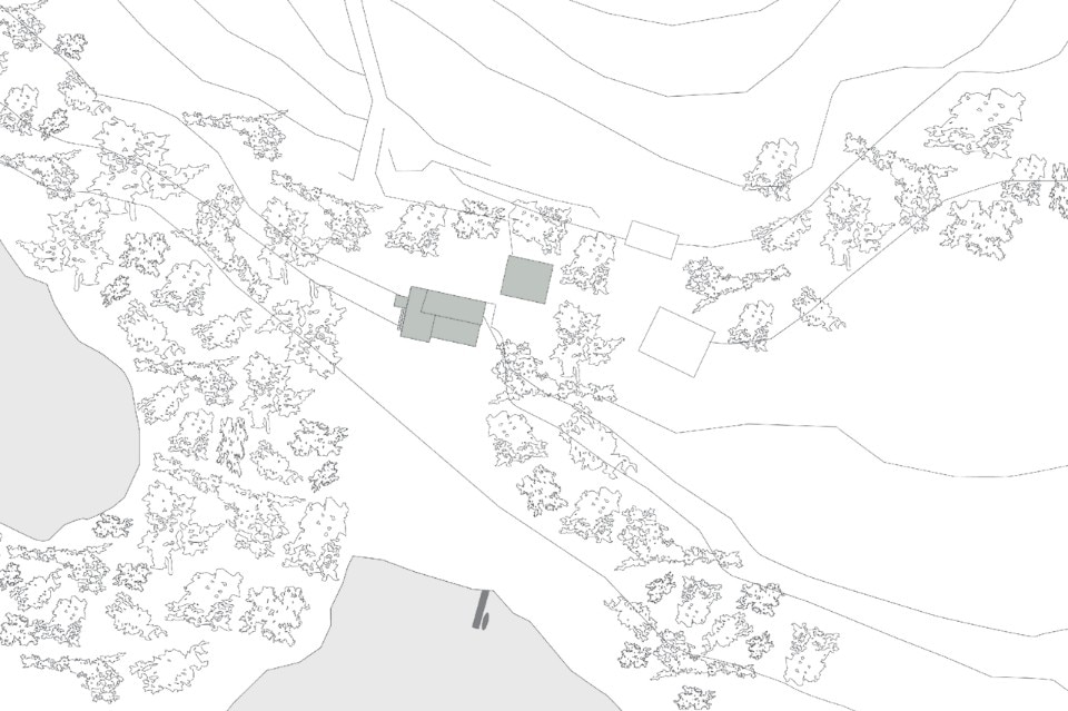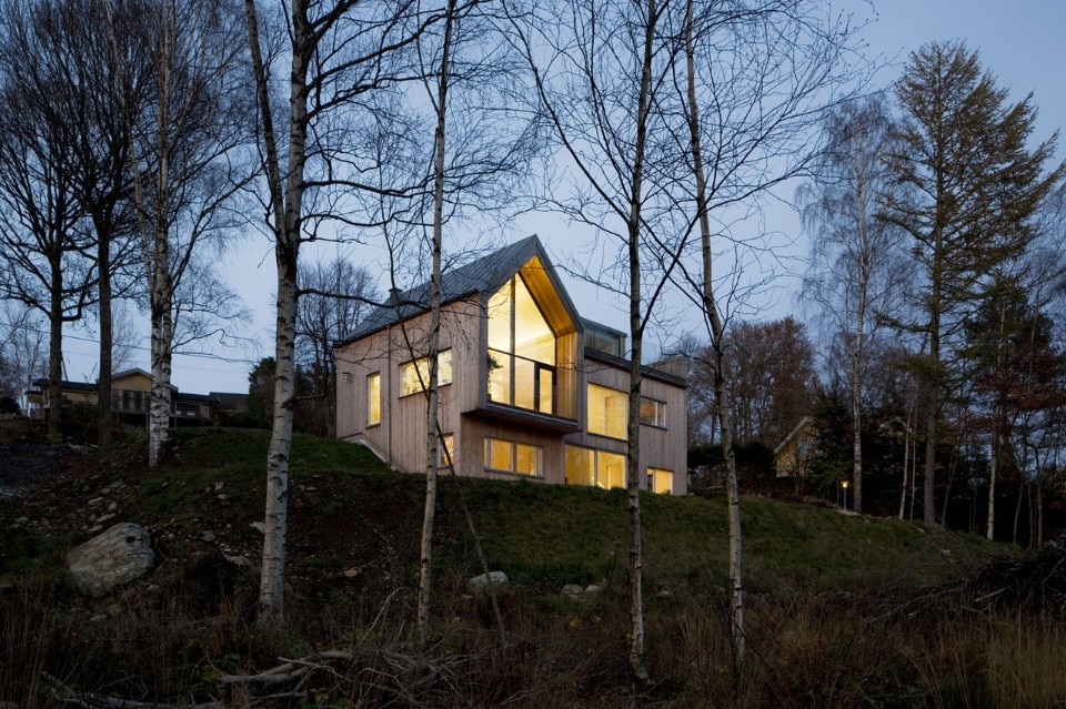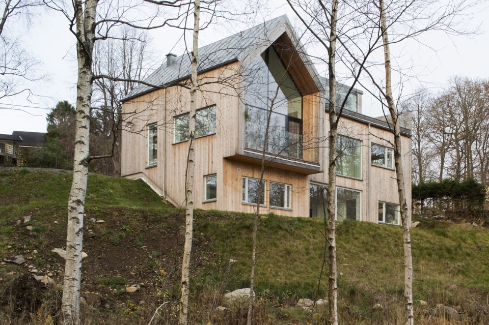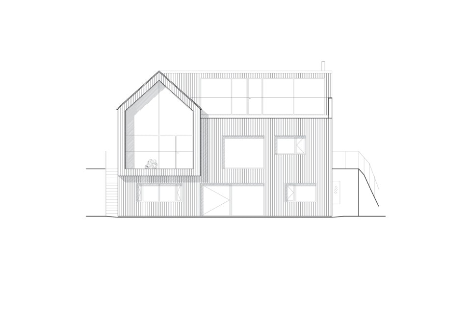 The closed entrance facade is shielding the view while arriving. Before entering the house you can glimpse the lake through the glassed entrance window and sense the church in the contours of the building.