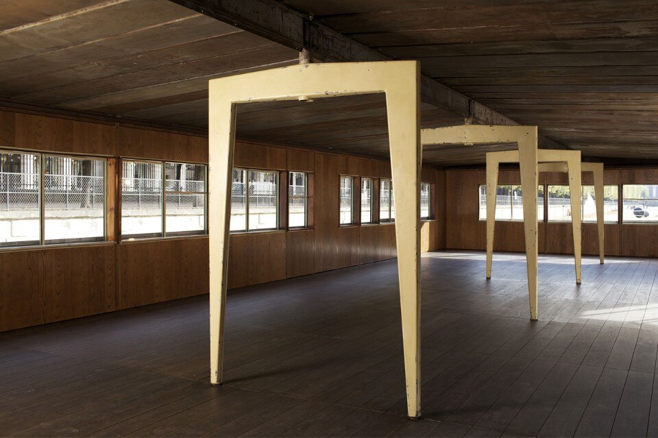 The asymmetrical Villejuif Demountable House is a lightweight project whose sheet-steel props support a cantilevered wooden roof. It was Prouvé’s response to a 1956 commission for a schoolhouse that could be easily dismantled and relocated. The school was later disassembled and its components used in other buildings. Prouvé’s design and engineering of these versatile structures and their components is now considered to be a milestone in twentieth century architecture.