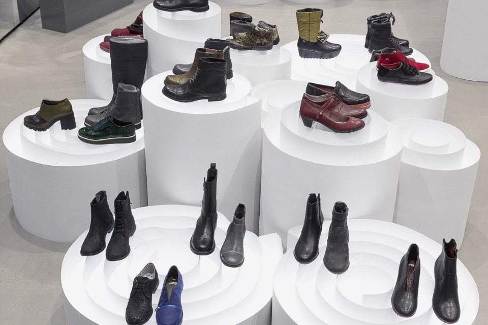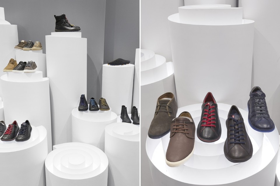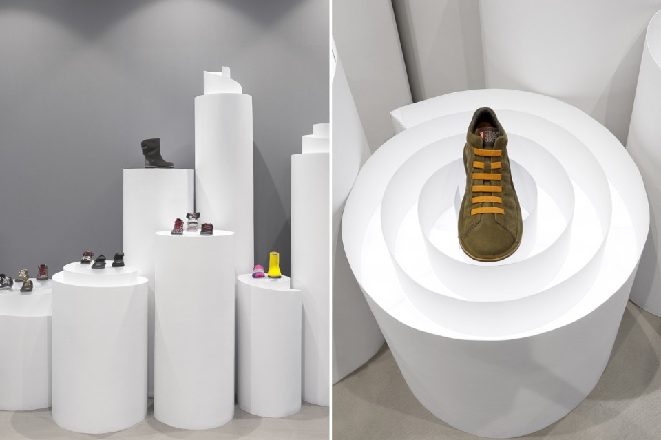 For Camper store in Stockholm Nendo designed rolled paper-like structures to display the footwear, giving a sense that the shoes are balancing on this objects.
