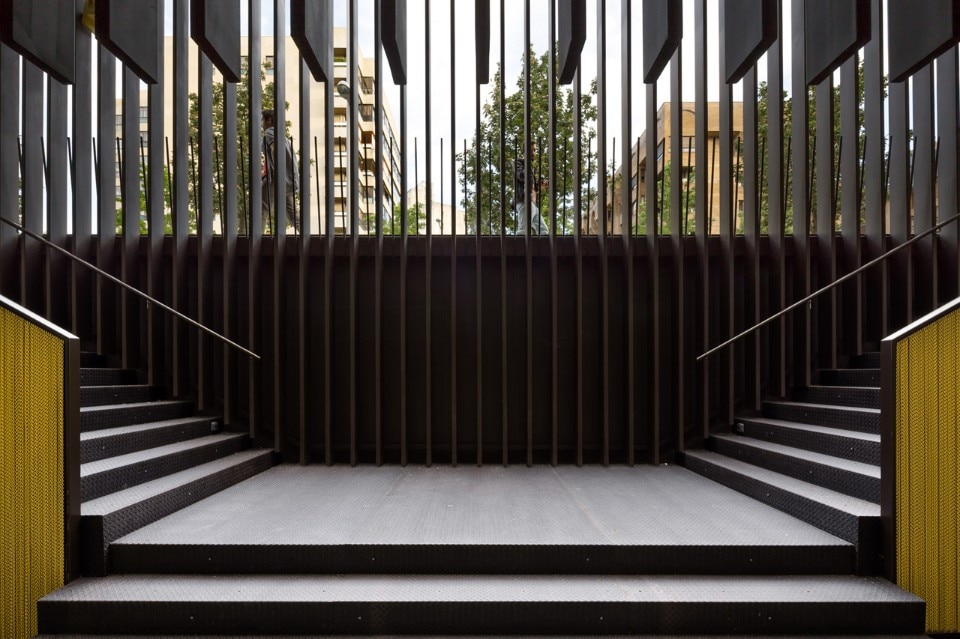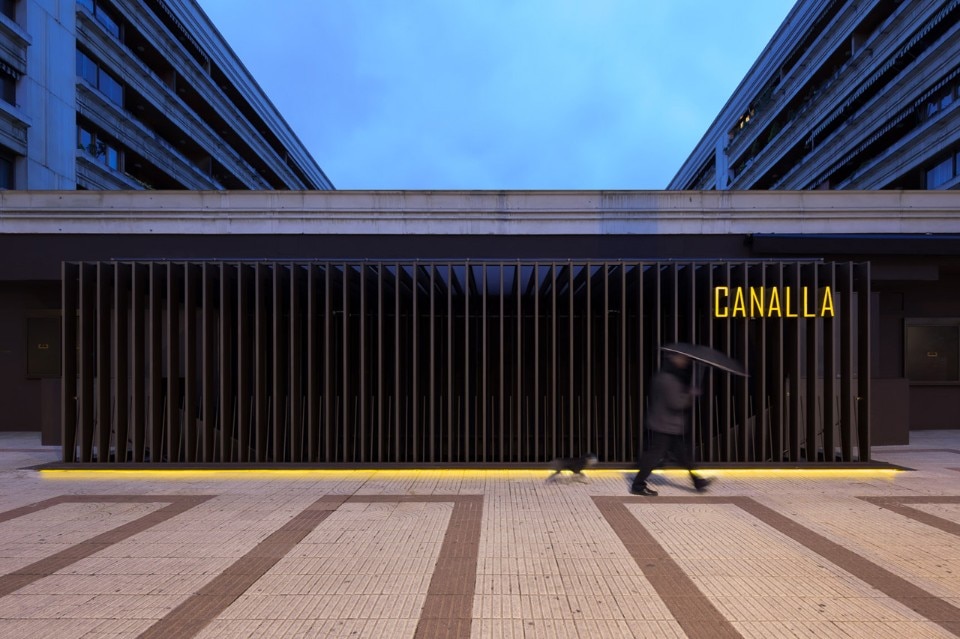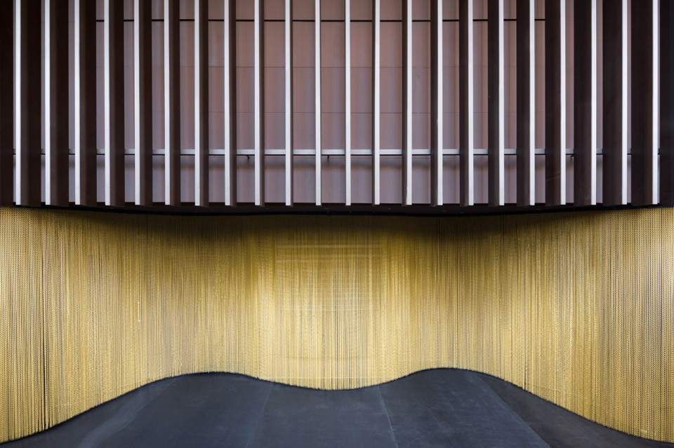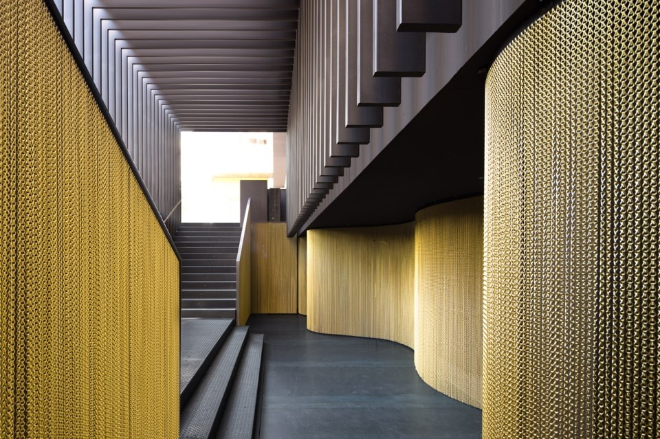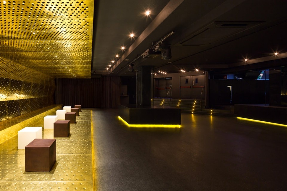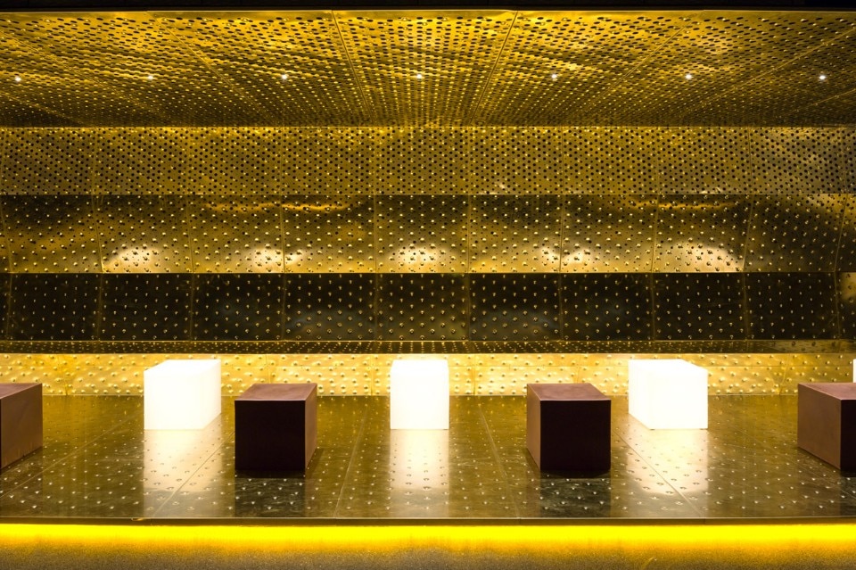 A long bar going through the whole premises provides the backbone of this space gradual composition. It is an exercise to control vibration, sparkling and glittering lights and is therefore far away from standards about space concepts. Being in this case distorted, such concepts promote a liquid atmosphere where forces between convulsion and soberness, between vibration and reverberation, are absorbed. Brass and black steel constitute the structural palette of this project.