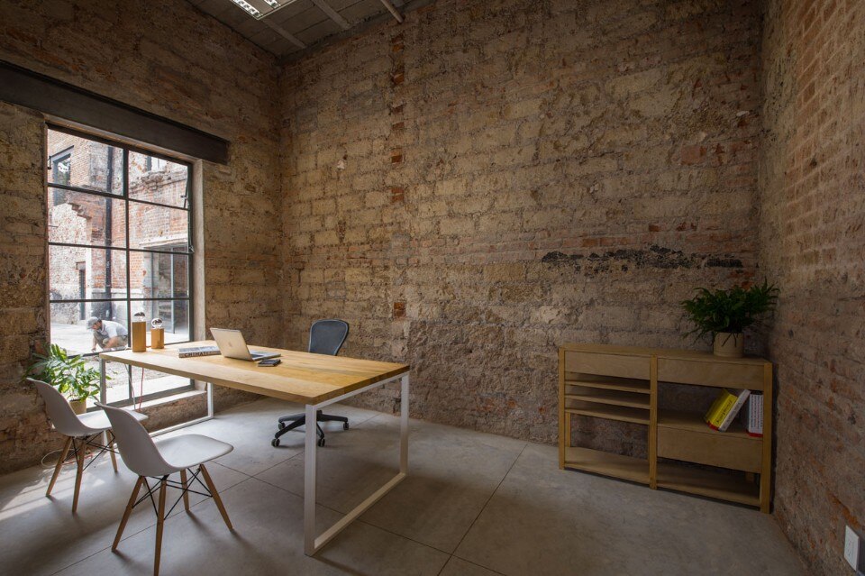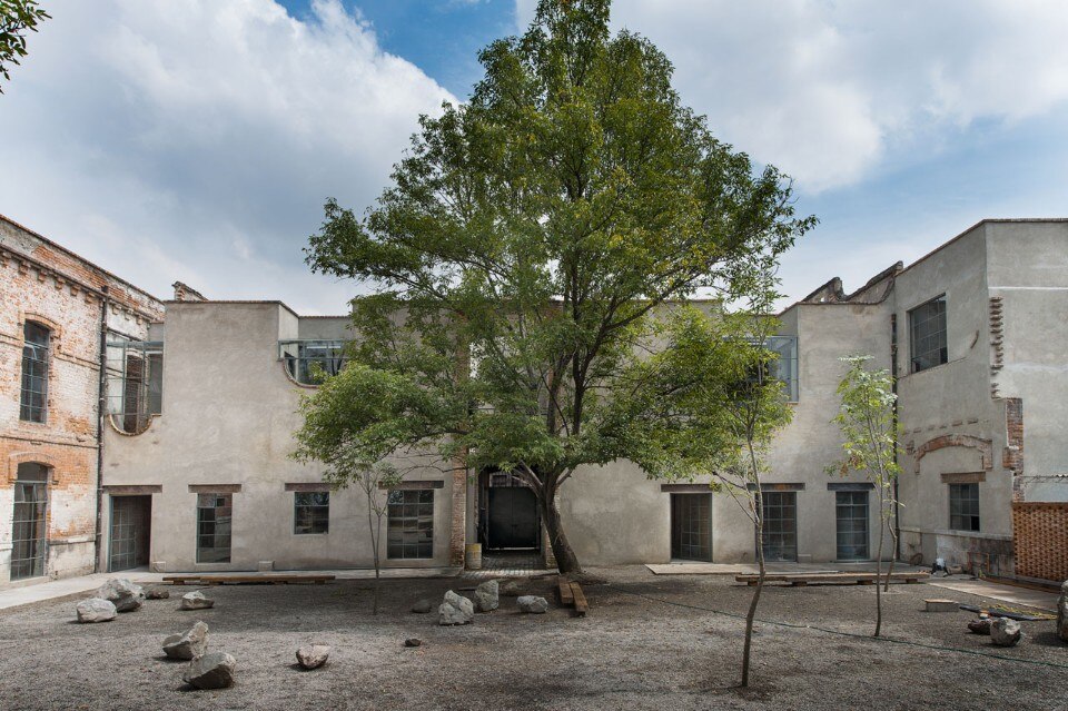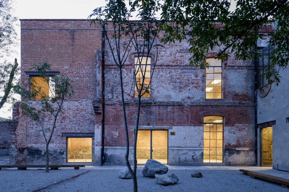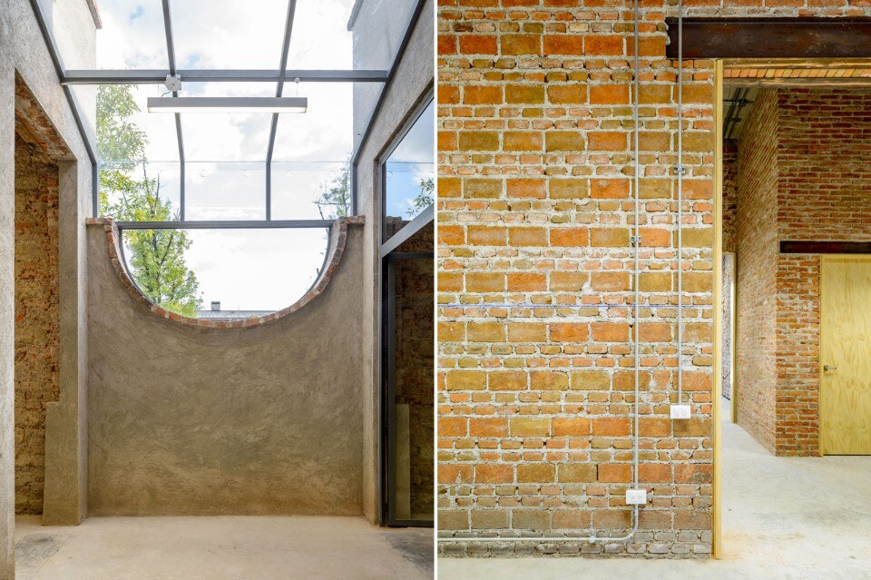 The building interior has plenty of different textures in every area: textures that only time can generate and will not be hidden. The garden with its ashes is mainly contemplative, its sober colors and textures contrast directly with the raw red of the bricks that surround it.