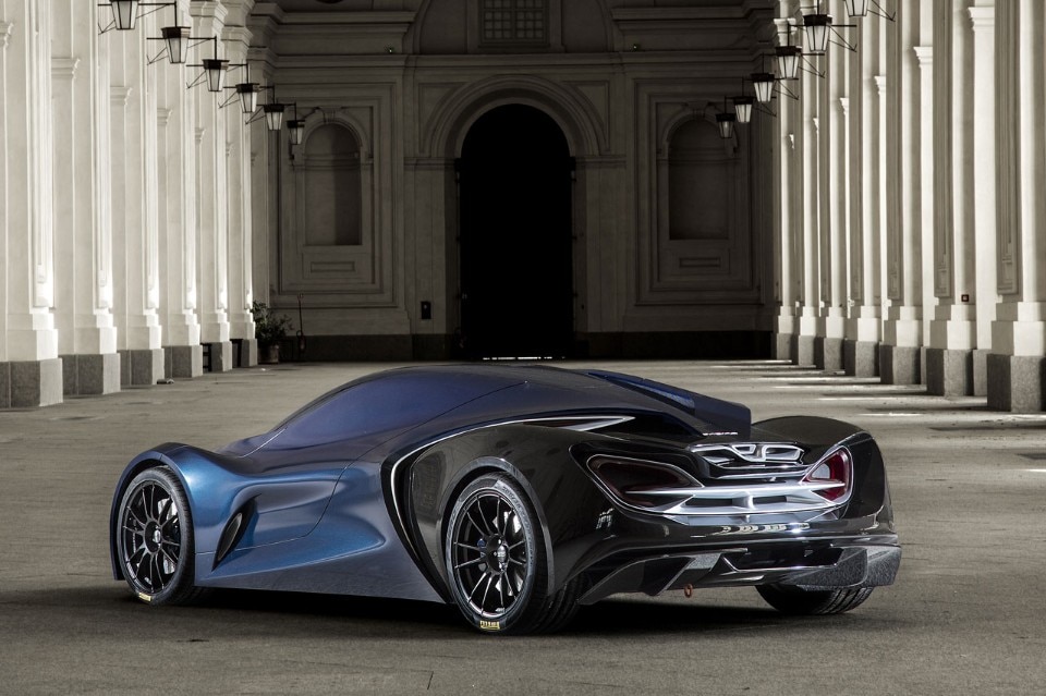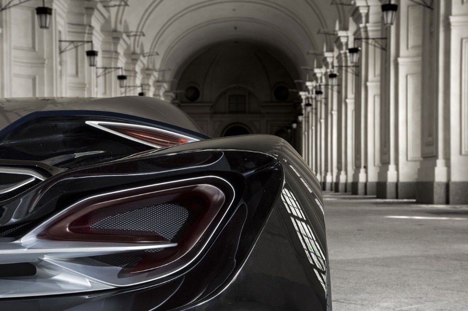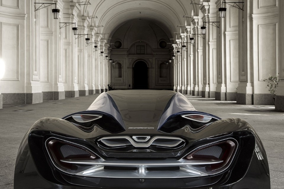 Syrma (length 4,730mm – width 1,980mm – height 1,155mm – pitch 2,790mm) features an extremely innovative layout: three staggered front seats with central driving position and rear power unit. The concept has a hybrid propulsion system with a V6 twin turbo, approximately 4-litre heat engine and an electric engine that, together, deliver around 900 hp.