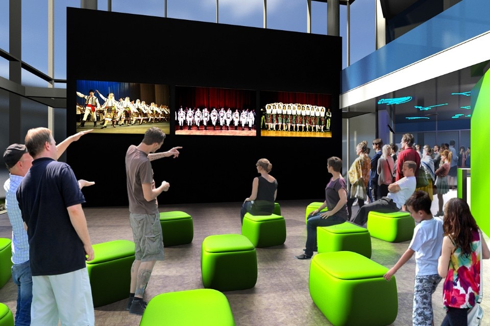 Coming inside the first thing what audience encounters is a special planetarium – a series of twelve constellation made of neon on black plastic which according to Pavel Braila “these constellations are not known by the world and can only be seen from Moldova”. The constellation of Bride, Plowman, Grape, Cheese, Stork, Jaws... First people who navigated the oceans were using stars to guide them and to discover new lands, here the stars are guiding the public to discover the country which some people from the audience never heard of.