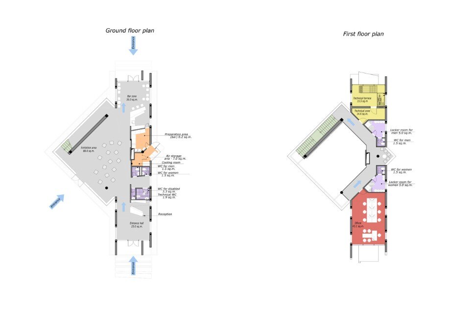 The long corridor sheltered with real green plants that goes through transparent glass cube reflects attention of the architects about the environment, nature, human beings and invites audience into a bio-zone of Moldovan farming and agriculture traditions, ecological food and its famous wine which are not yet well known in the western world and to encourage visitors to get in line and be curious about what the pavilion has to tell more.