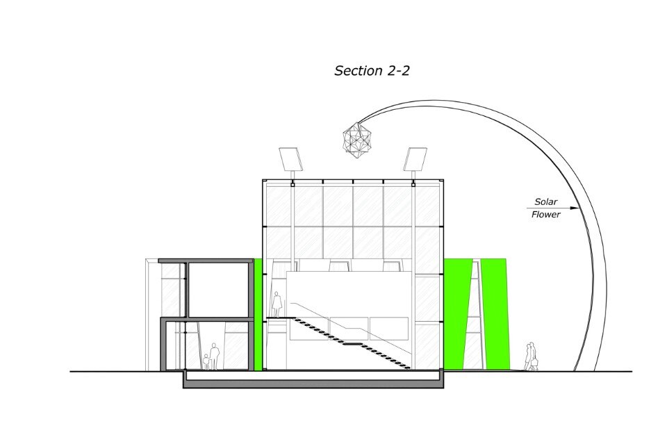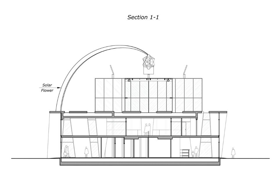 “Solar Flower” – the key element of the Pavilion – is a triple mirror cube which surface consists of thousands of facets, installed on a top of sloped metal stalk over the top of the transparent glass cube. A mirror system installed on the each corner of the glass cube follows the movement of sun all day long and reflect the sunbeam upon a rotating mirror cube, creating an effect of myriad spots of light spinning around all over the space.
