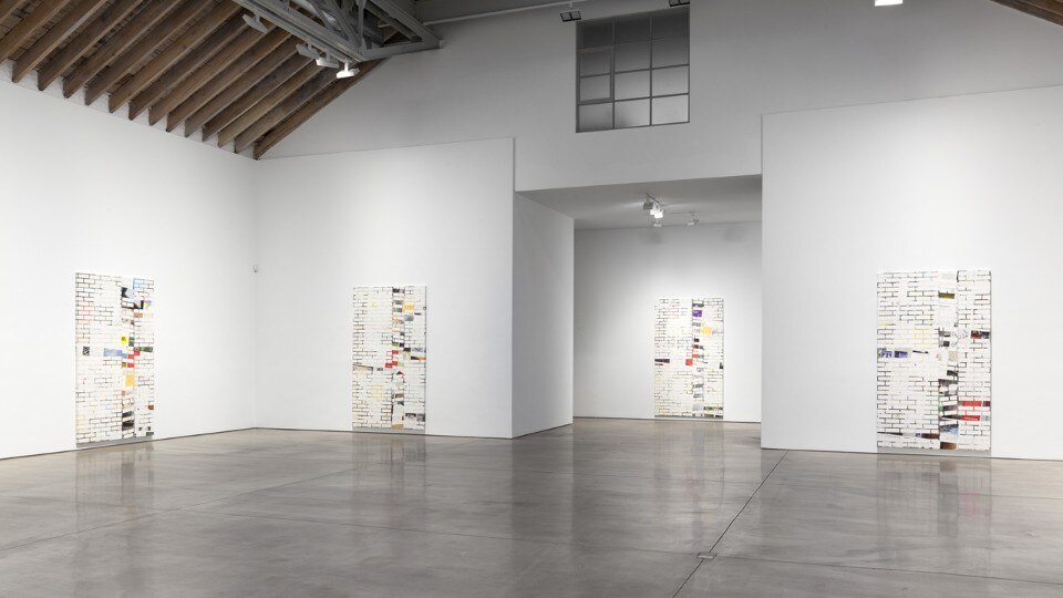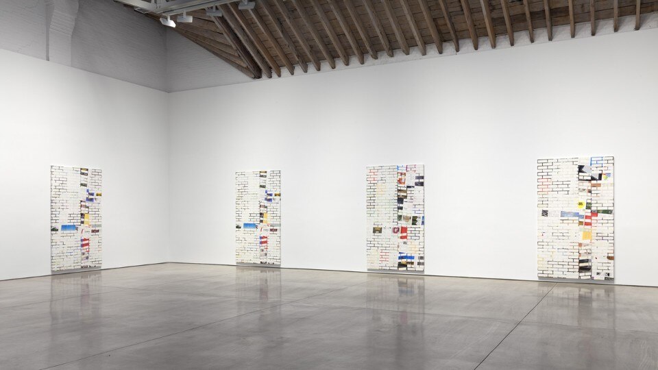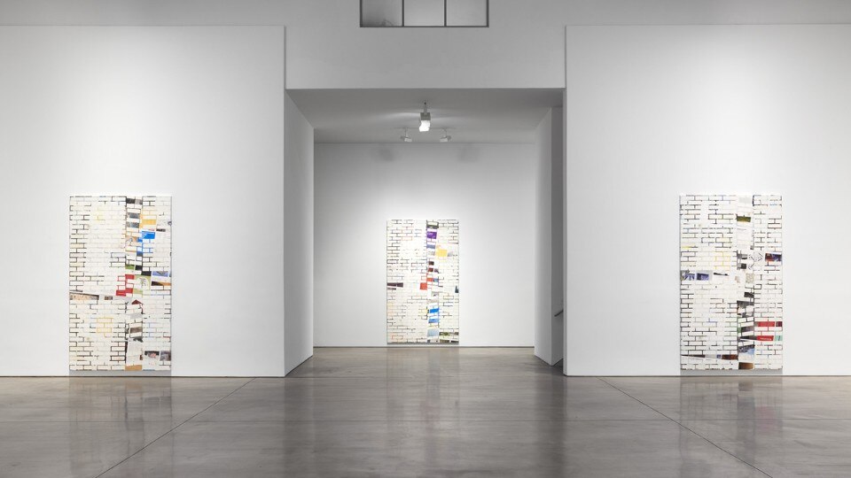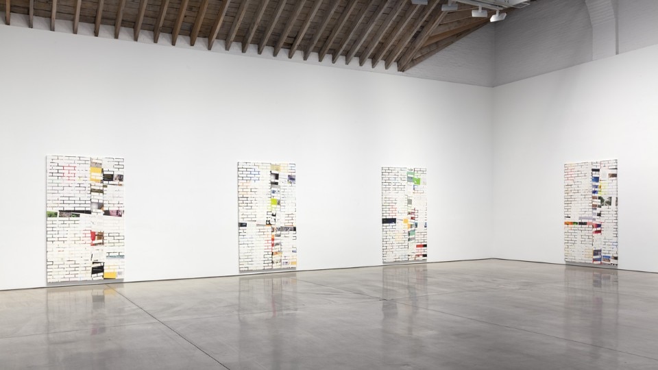 The resulting panels oscillate between illusionism and flatness, as each 10-foot canvas appears to be at once a brick wall and a variation of an abstract grid. Between the gaps, glossy pages stand in as the “mortar” and seem to emerge from behind the bricks, when in fact they are pasted on top of the canvas surface. Walker’s cycle of twelve works corresponds to the publication’s twelve monthly issues, as each painting draws from one issue of Domus magazine.