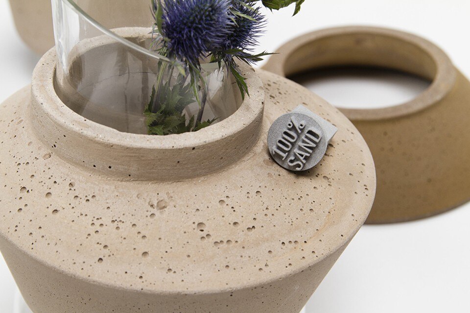 A much greater tension is added to the glass, because of the contrast in texture between its shiny skin and the rundowned, cooked appearance of the concrete. Each object comes with a narrative, and clearly reveals the traces of its making and process. The objects are storytellers, to make an awareness of the amount of things we have around us containing sand, and stop thinking of it as weakly usable material.