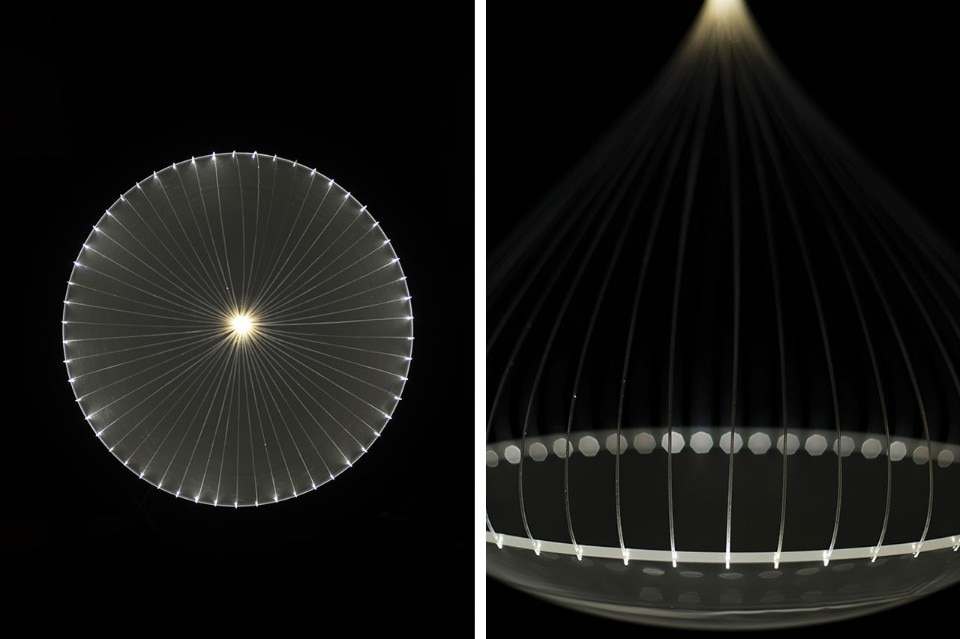 This lamp is characterized by a form similar to a parachute, reminding the flying squirrel; it is composed by eight pieces made of PMMA half mirror material.