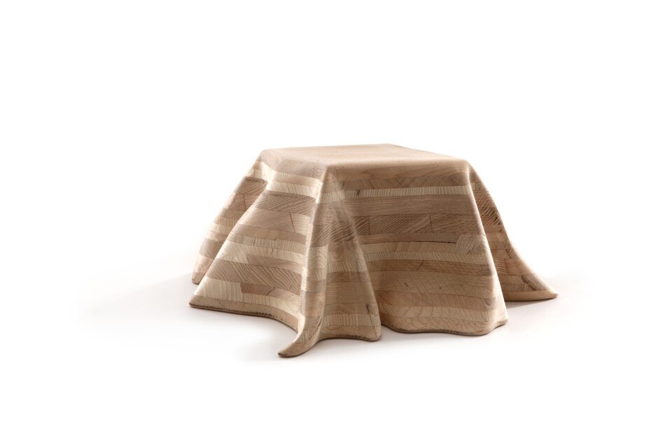Front, Veiled Box. The Veiled Box is an object that is always on the point of being unveiled, and celebrates the exciting moment of revealing a new piece of furniture. A large piece of wood has been digitally milled to make it look like a box under drapery