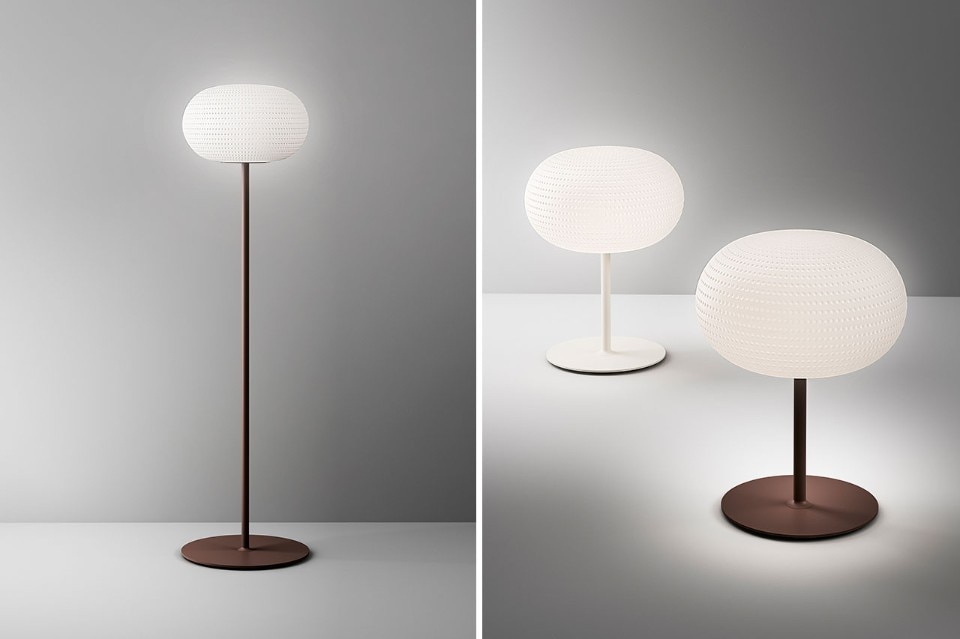 The Bianca family of lamps by Matti Klenell has a blown-glass diffuser adorned with an orderly series of delicate, light grooves that, on the white glass, look like tiny prints recently left on fresh snow and feature a fabric-like texture, an effect achieved by pressing the still-warm glass on a worked surface.